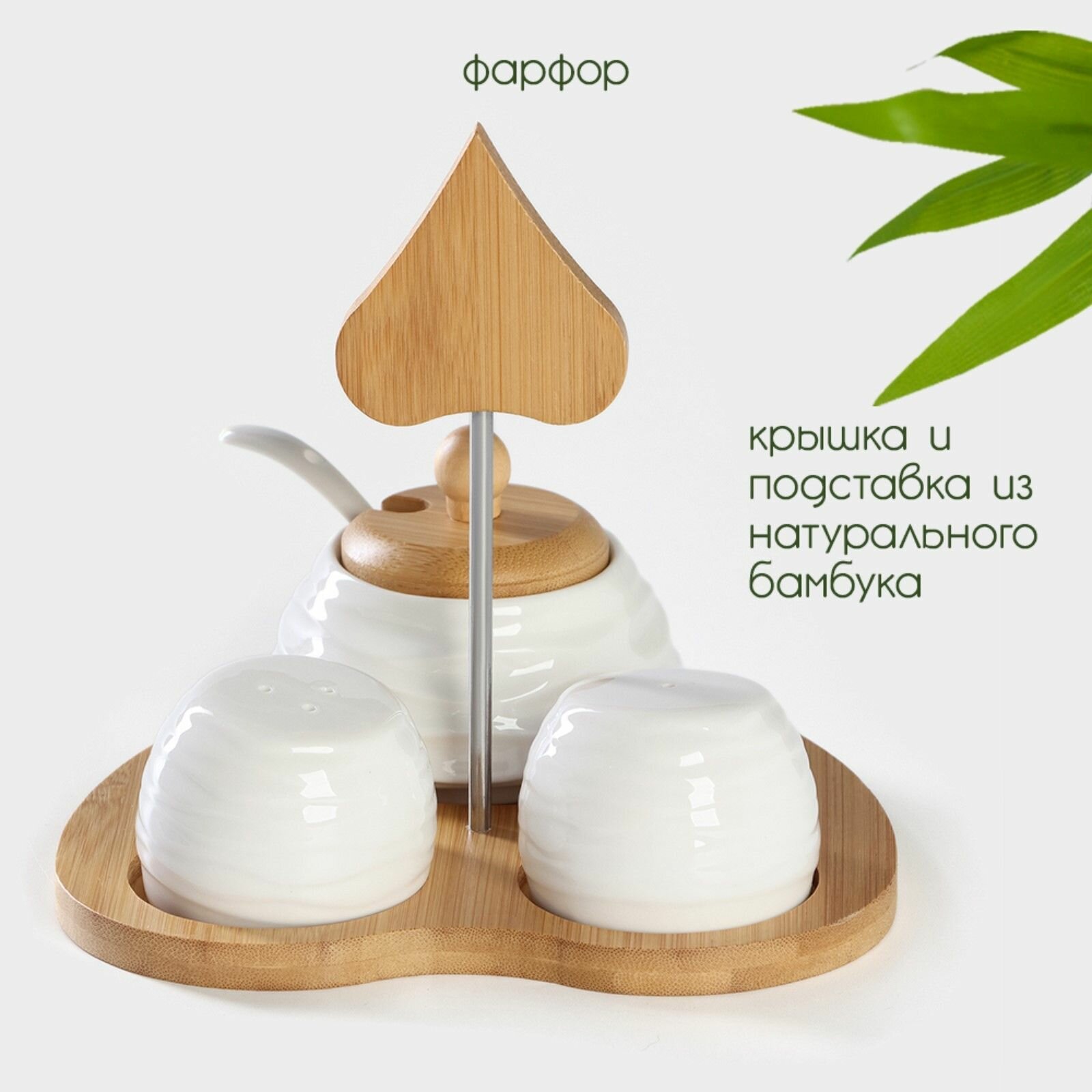 Набор керамический для специй на деревянной подставке Доляна "Эстет. Герда", 3 предмета: солонка, перечница, сахарница с ложкой 1 130 ₽