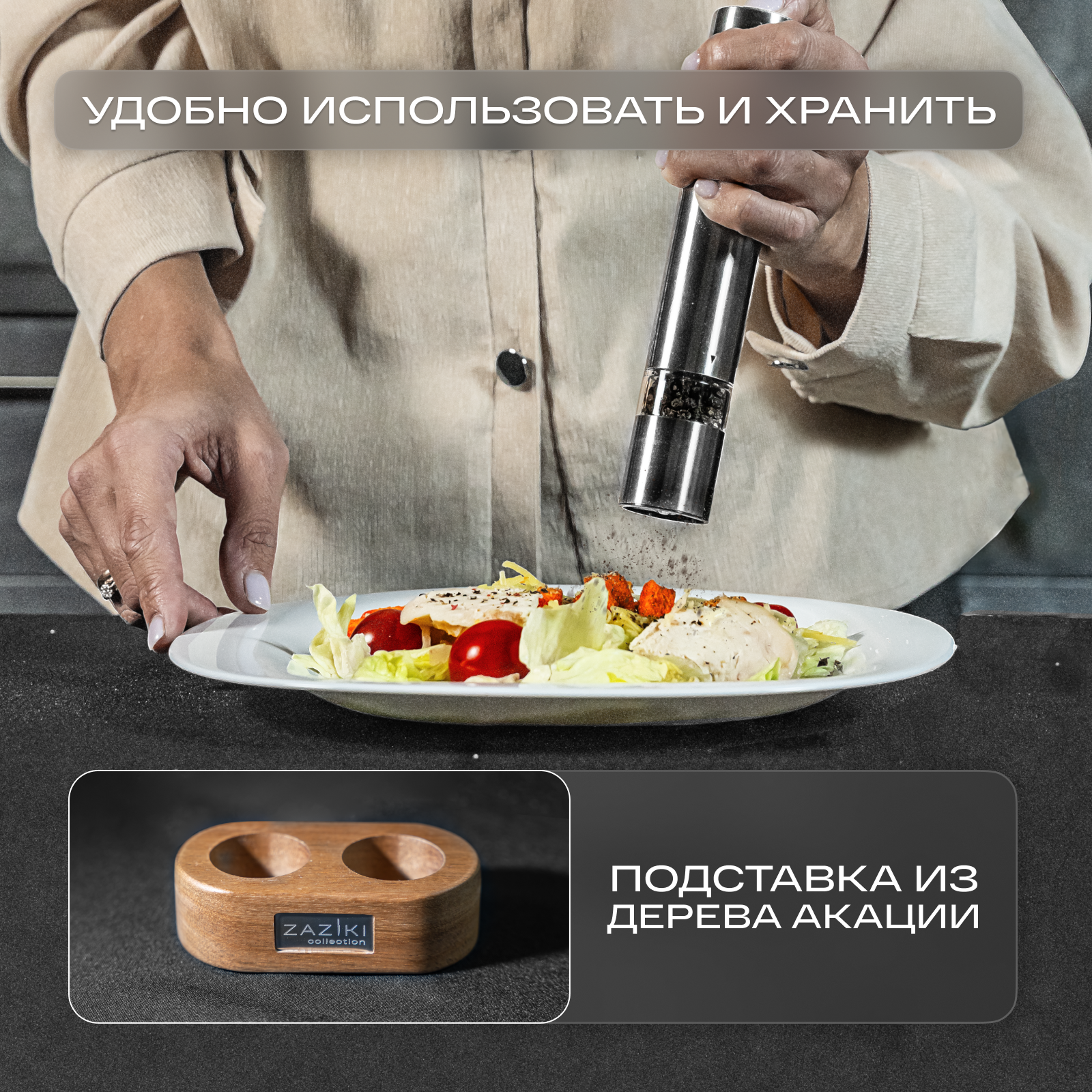 Набор мельниц для специй и соли Zaziki электрические на батарейках, электромельница на деревянной подставке, набор 2 шт информация: