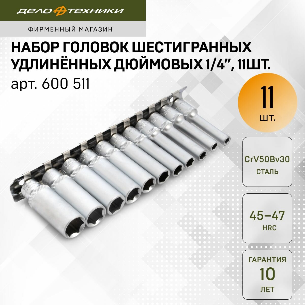 Набор головок шестигранных удлинённых дюймовых 1/4" 11 шт, Дело Техники, 600511 информация: