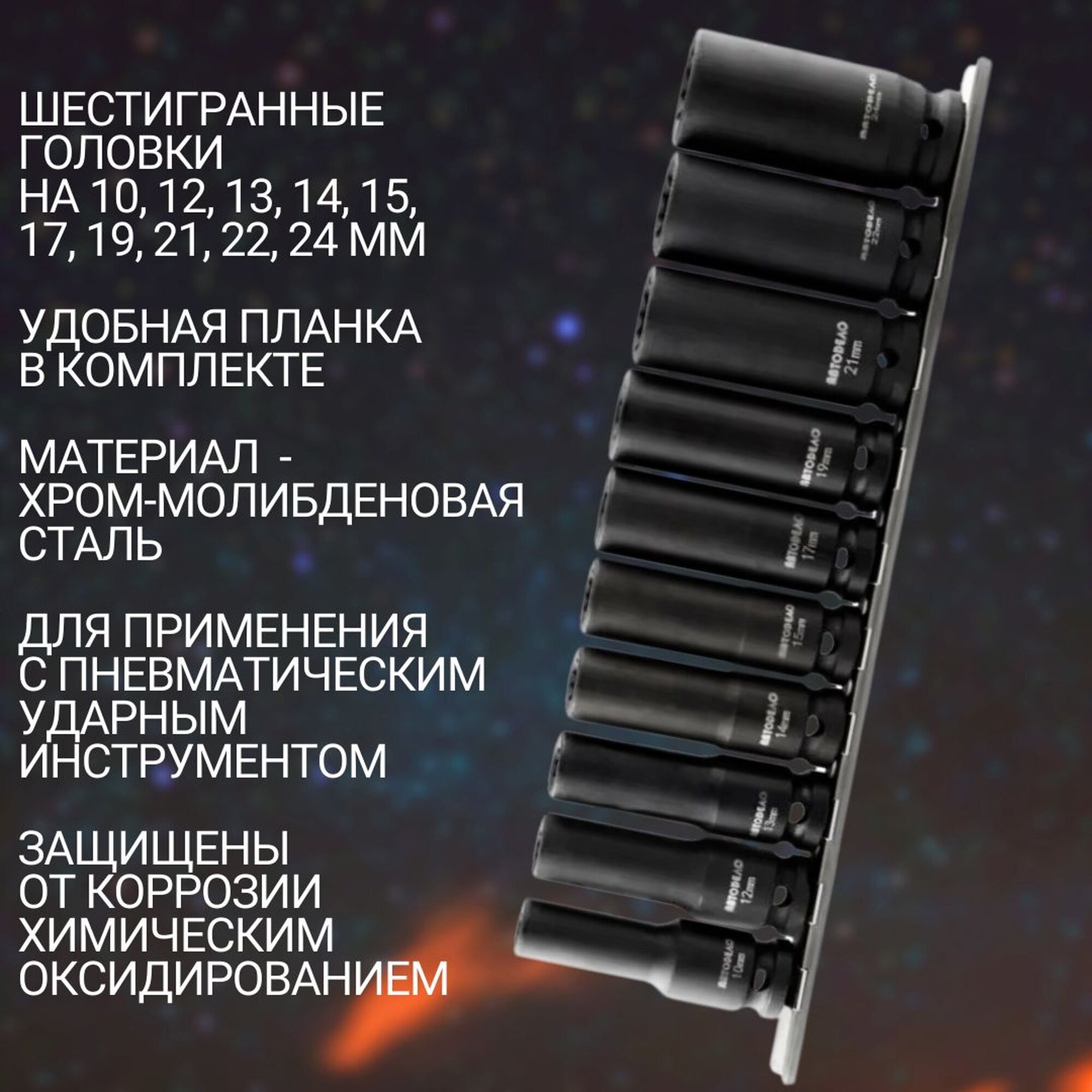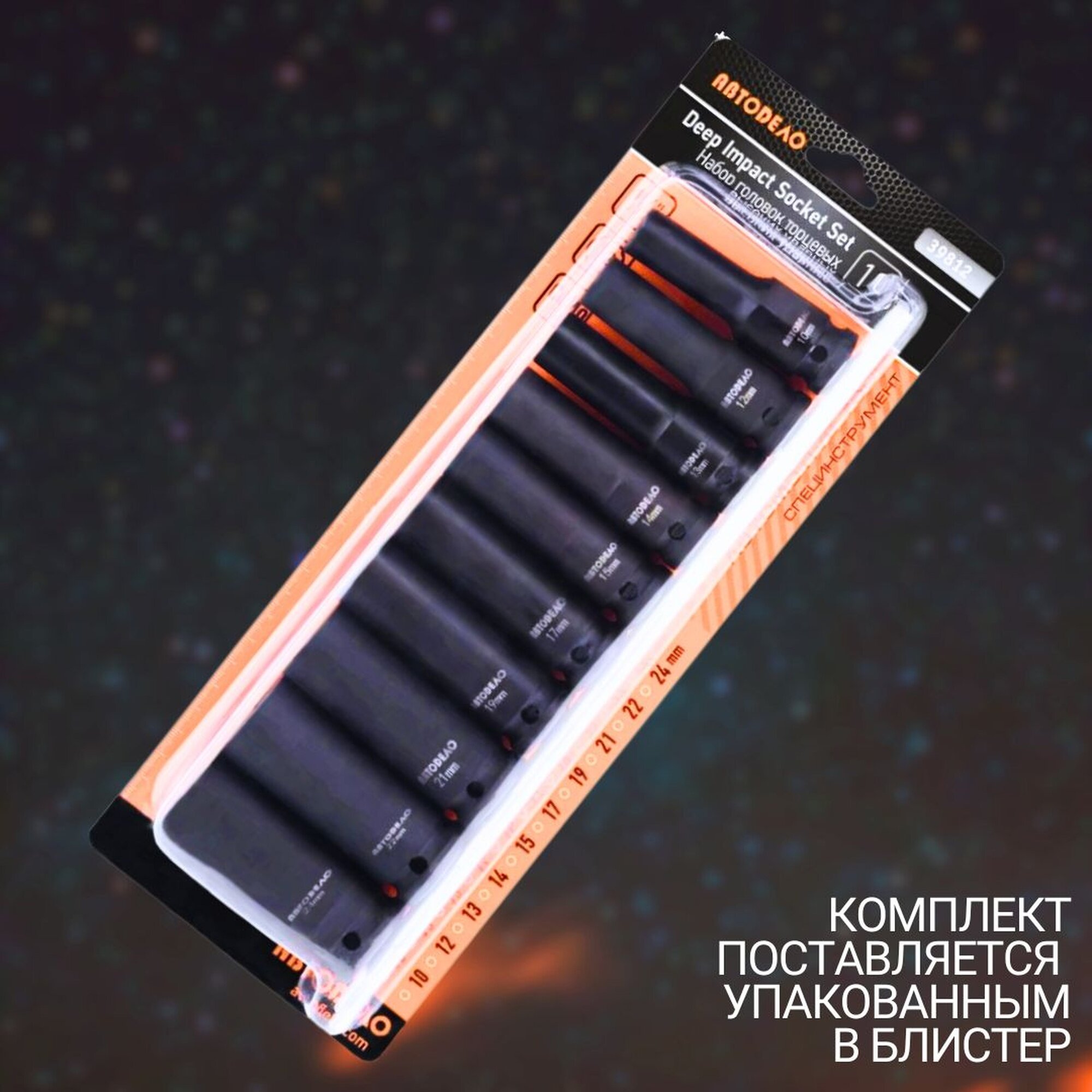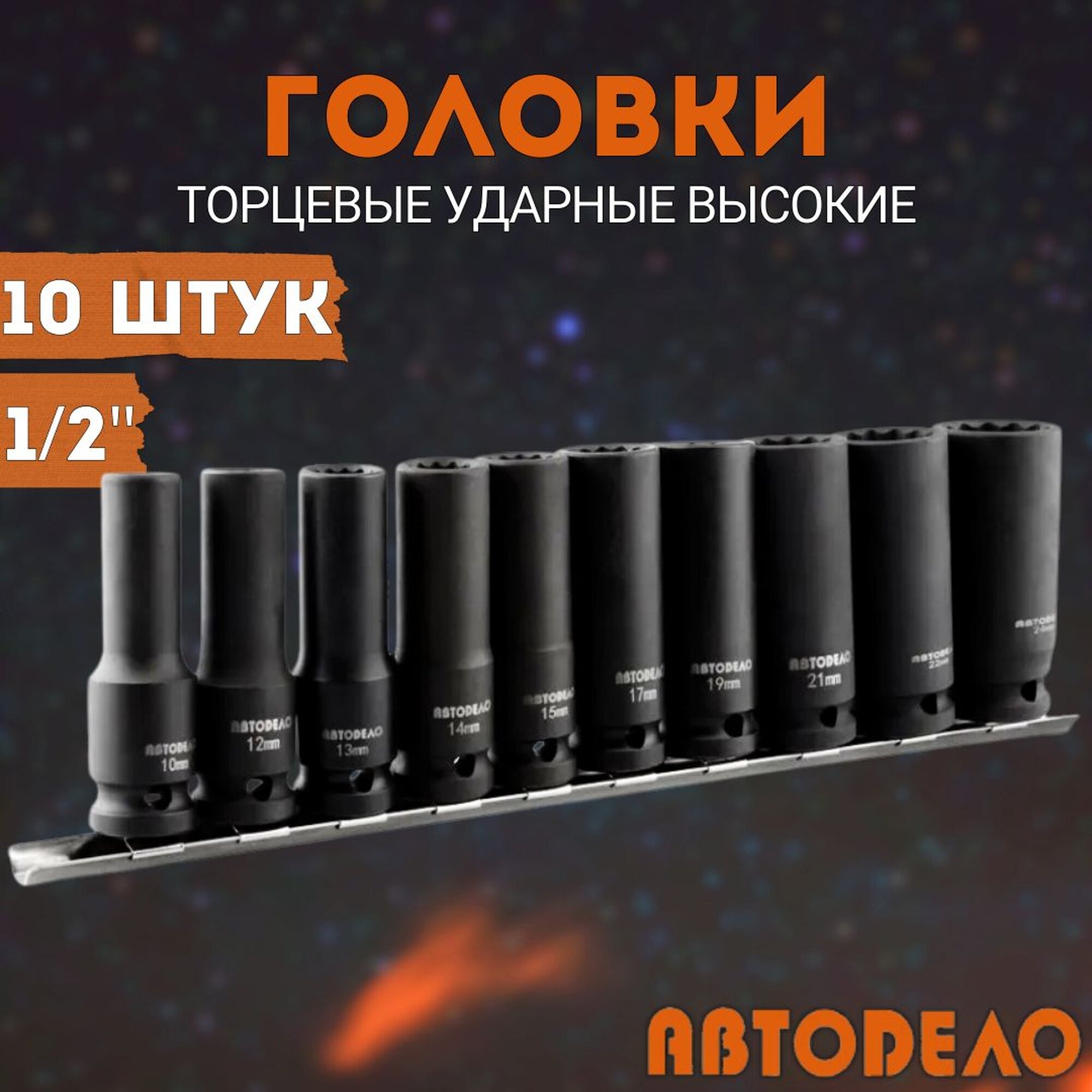 Набор головок торцевых 1/2", 6 граней, 10-24 мм, 10 штук, удлиненные ударные, планка Автоdело 39812 информация: