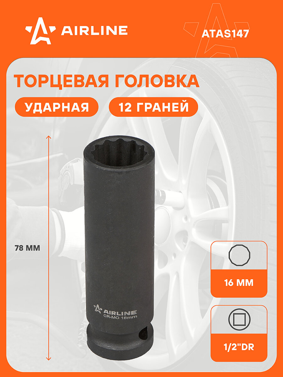 Головка ударная торцевая 1/2" DR двенадцатигранная 16мм L=78мм ATAS147 AIRLINE информация: