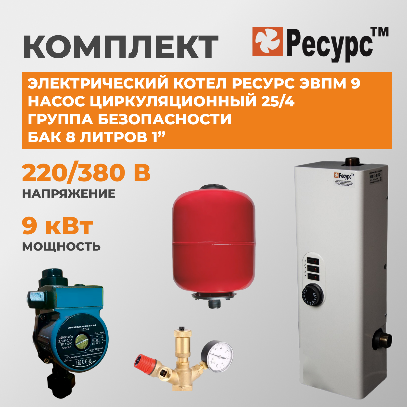 Котел электрический Ресурс ЭВПМ 9 кВт, комплект, насос 25/4, Группа безопасности, Бак 8 литров информация: