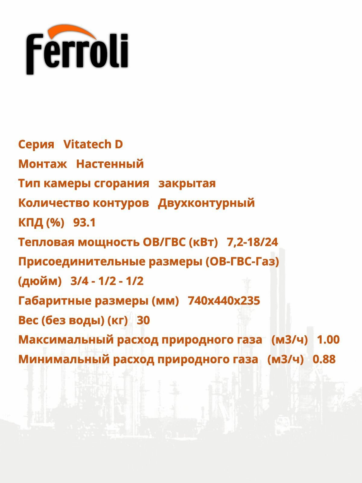 Газовый котел Ferroli Vitatech D F 24 кВт (настенный, двухконтурный) информация: