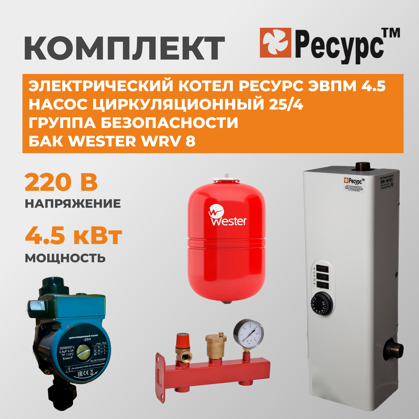 Котел электрический Ресурс ЭВПМ 4,5 кВт, комплект, насос 25/4, Группа безопасности SGT34, Бак Wester WRV-8 информация: