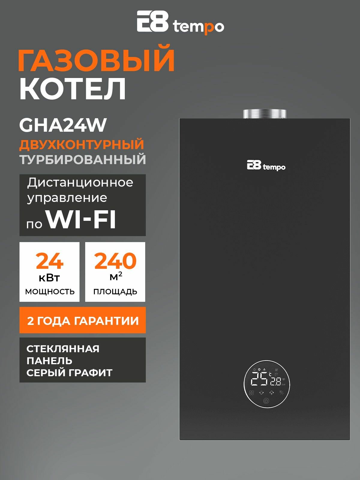 Котел газовый настенный двухконтурный турбированный 24 кВт E8 Tempo GHA24W (стеклянная панель, цвет серый графит) информация: