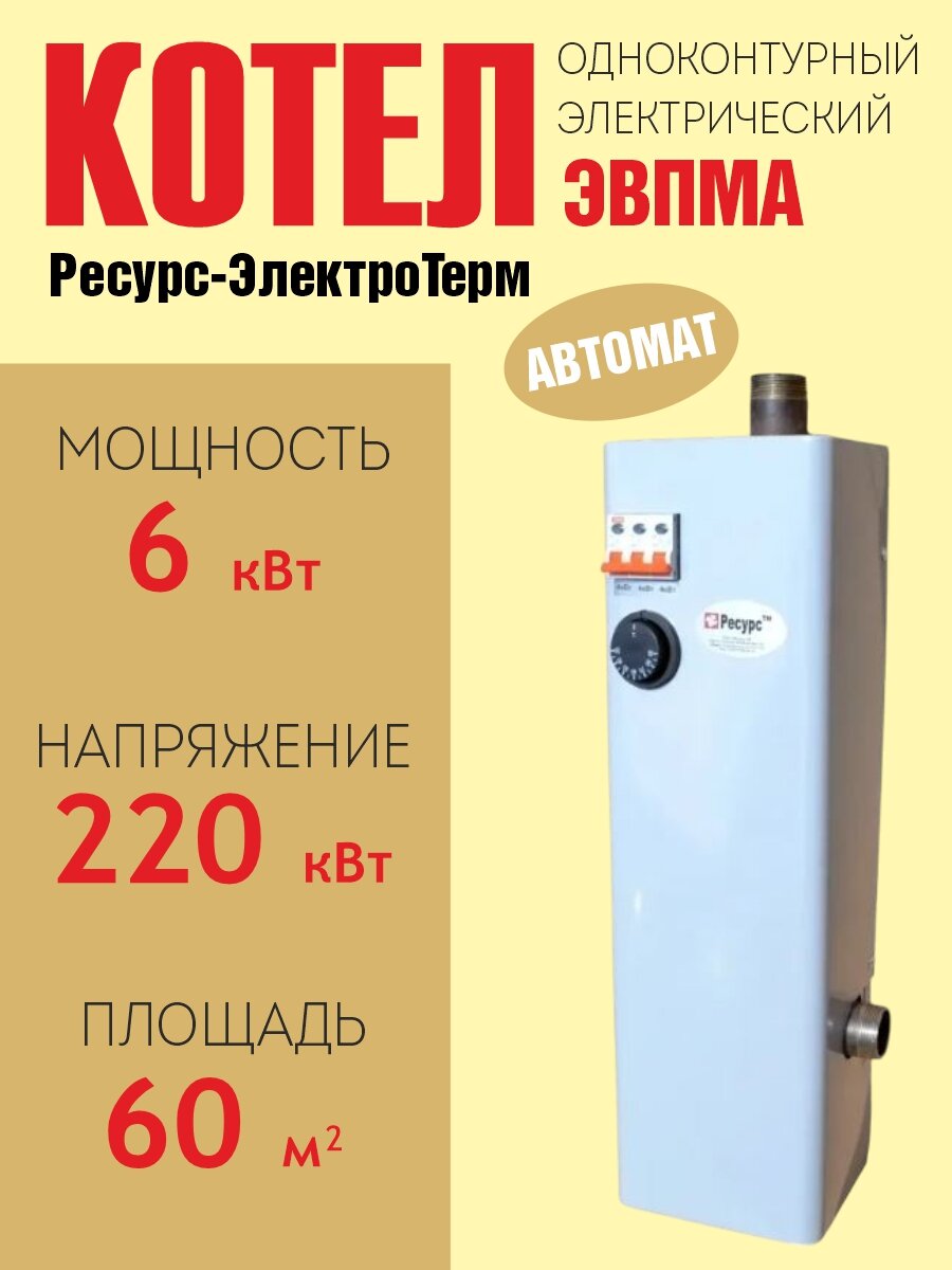 Котел электрический Ресурс "ЭВПМ-а", одноконтурный, настенный, 6кВт информация: