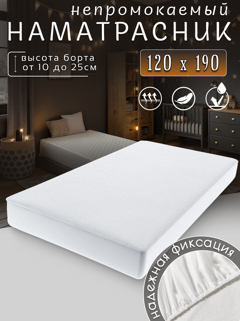 Наматрасник непромокаемый с бортом, белый, полиэстер, 120x190х25 см информация: