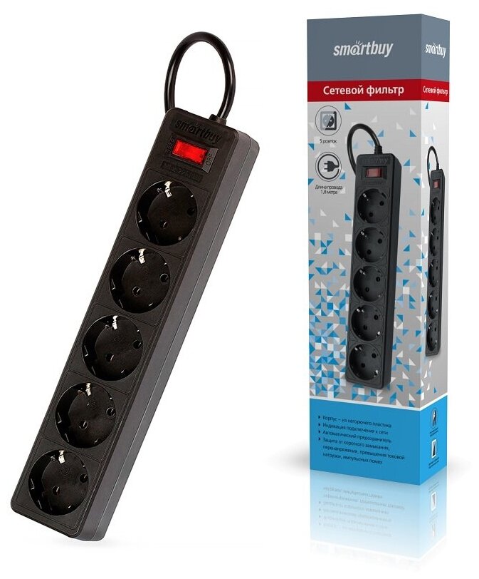 Удлинитель с функцией сетевого фильтра, 10А, 2 200 Вт, 5 розеток, длина 3,0 м, черный, Smartbuy информация: