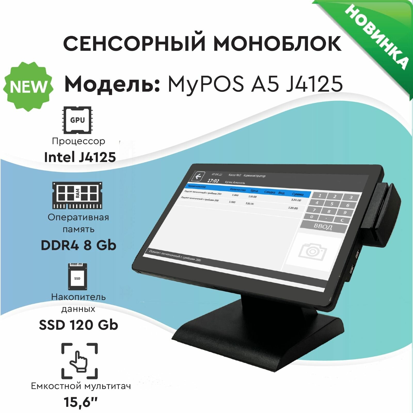 Сенсорный моноблок MyPOS А5 15,6" LCD, J4125, RAM 8Gb, SSD 128Gb, 2 RS232, 6 USB, MSR, черный информация: