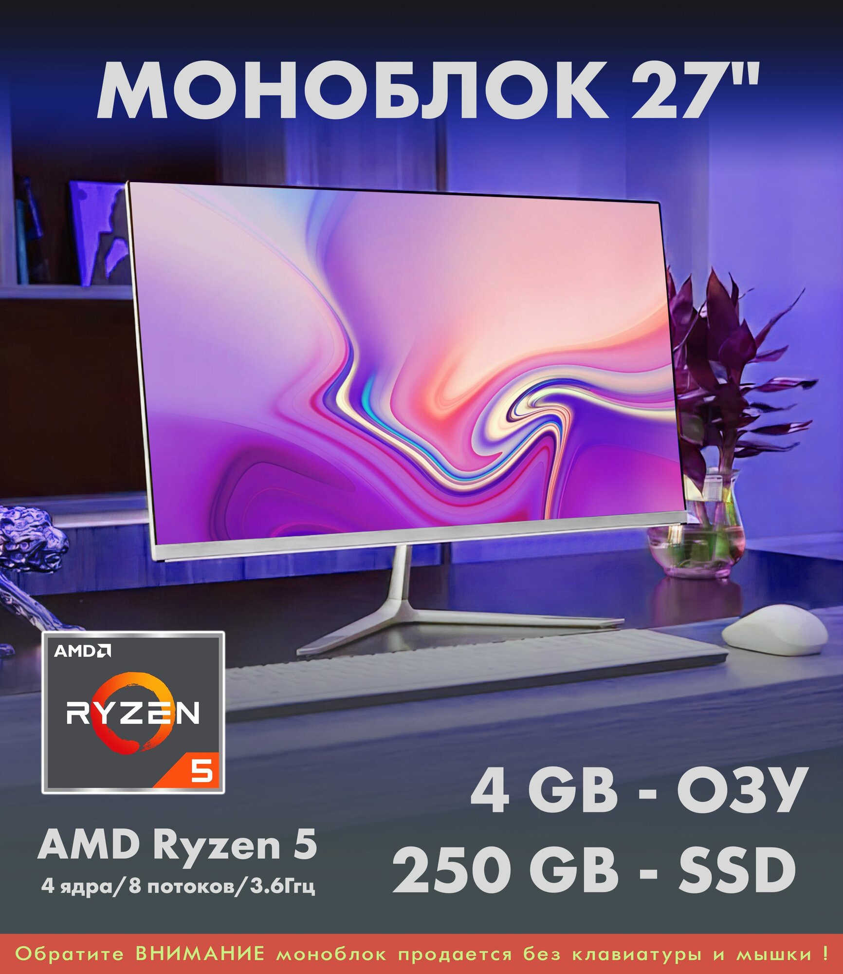 27" Моноблок Ryzen 5-2500U (4 ядра/8 потоков/3.6Ггц), 4GB, SSD 250GB информация: