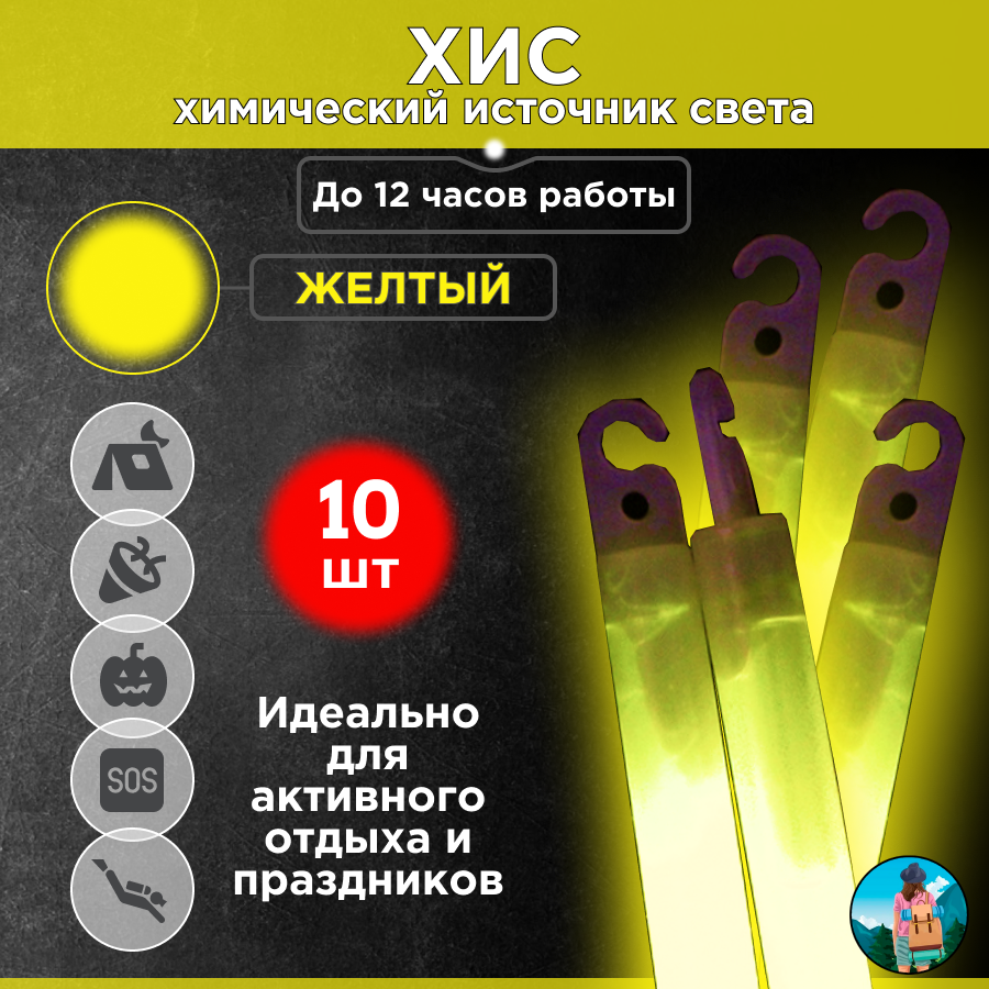 10 цен на Химический источник света (ХИС), 10шт. желтый, большая неоновая палочка 15х150 мм, тактический источник света без батареек