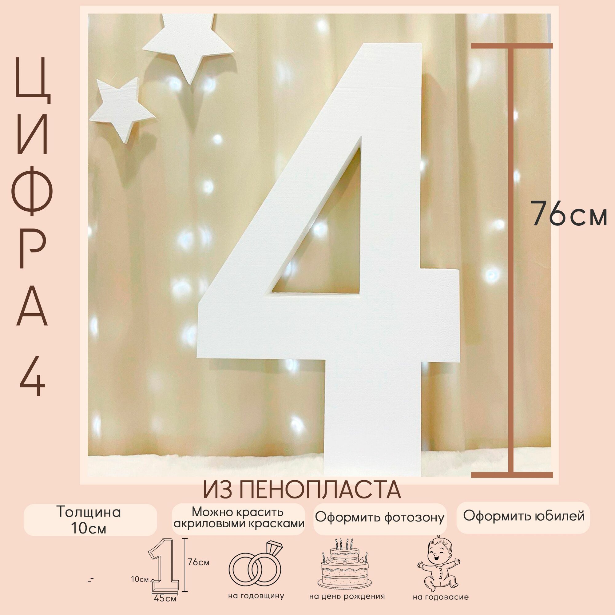 Отзывы на Цифра 4 из пенопласта, аксессуар для фотосессии, декор для фотозоны 76х45х10см.