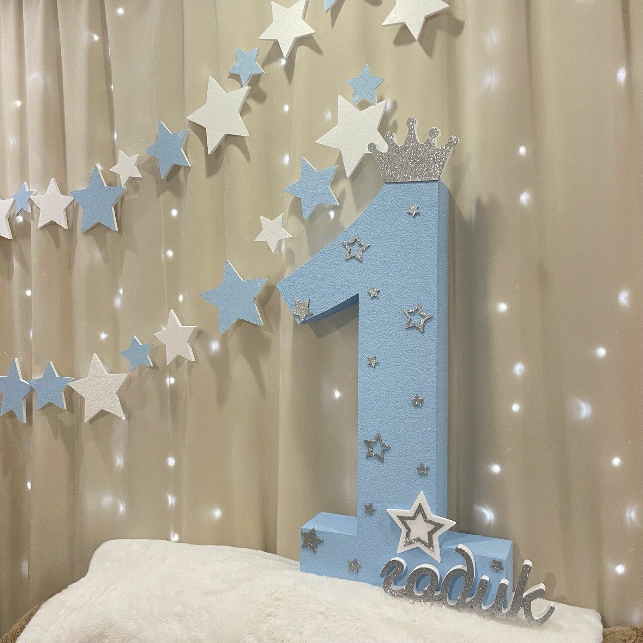 Отзывы на Цифра 1 голубая с серебряной короной, звездами. Гирлянда из звезд 2 шт, набор для декора праздника из пенопласта