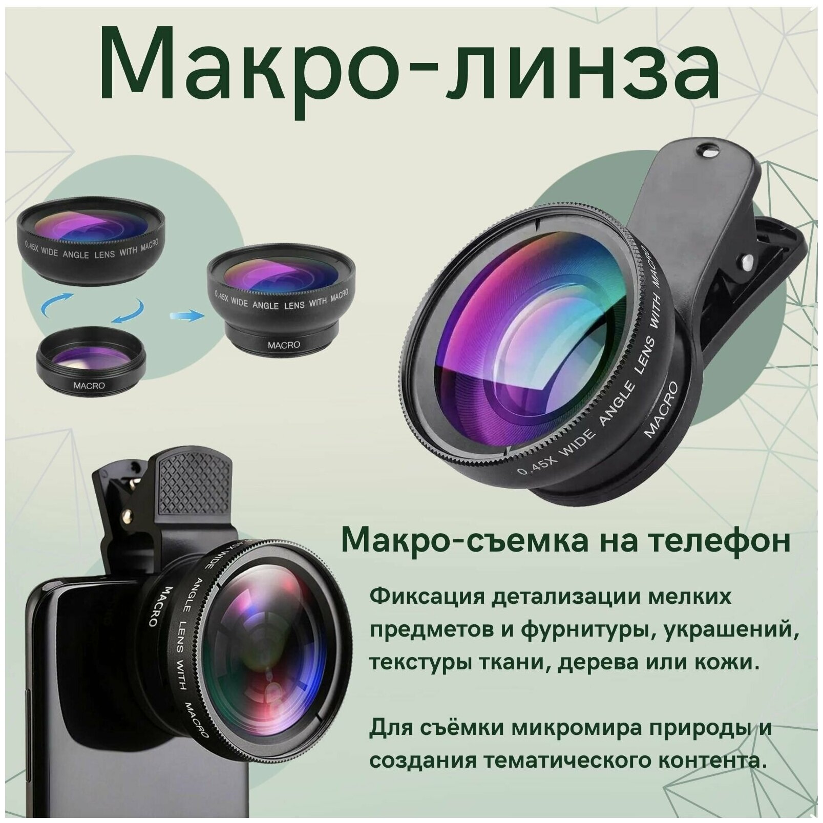 Макролинза для телефона, смартфона 0.45X широкоугольный и 15X / Фишай линза / Увеличительный объектив на телефон информация: