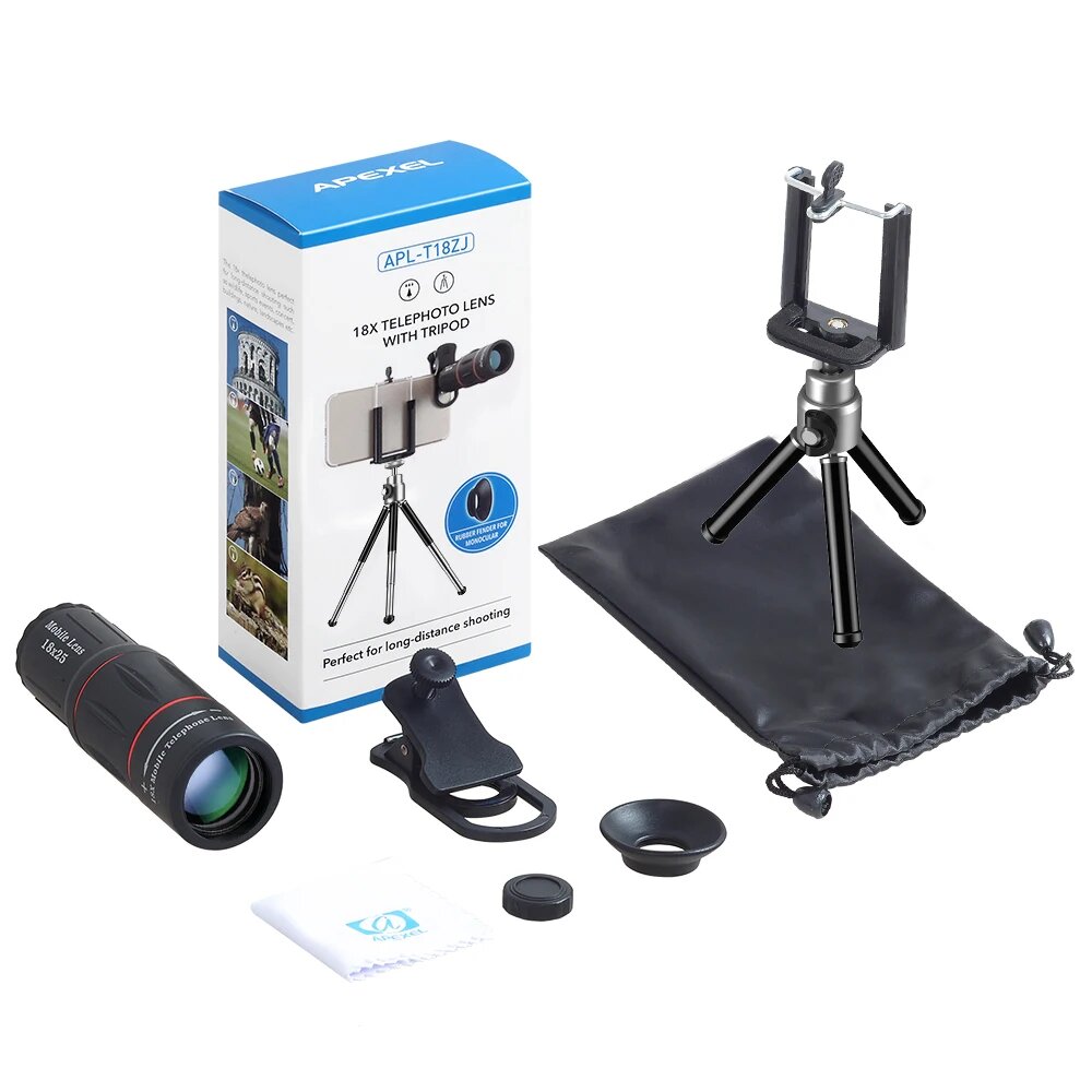 10 цен на Телескоп APEXEL 18X, универсальный Трипод для селфи с зажимом для всех смартфонов, Lens with Tripod