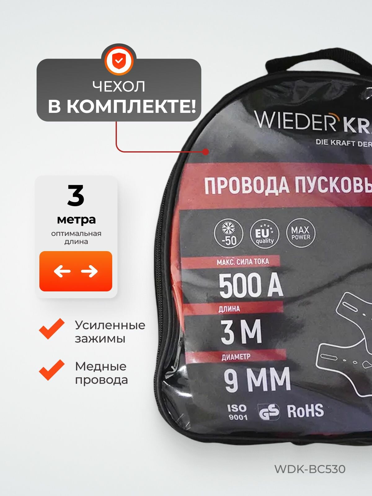 Провода пусковые для прикуривания 500А, 3 м WiederKraft WDK-BC530 информация: