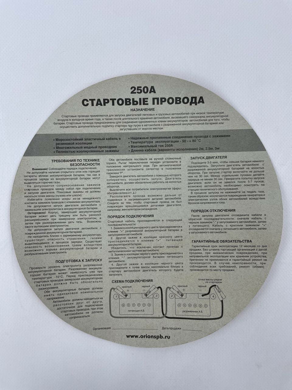 Провода для прикуривания автомобиля пусковые на 250 А L=2м, сумка в комплекте, морозостойкие информация: