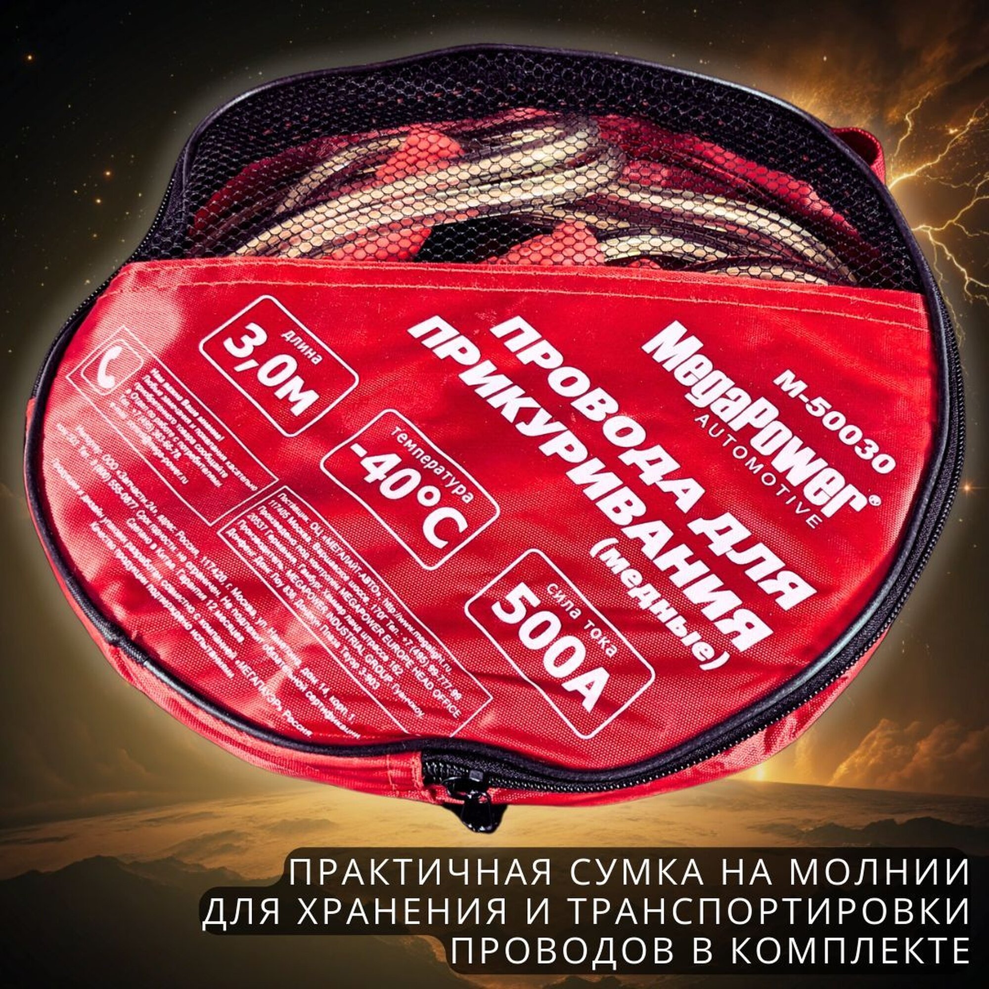 Провода для прикуривания автомобиля 500A, 3 метра, медь, морозостойкие, в сумке, MEGAPOWER 77750030 информация: