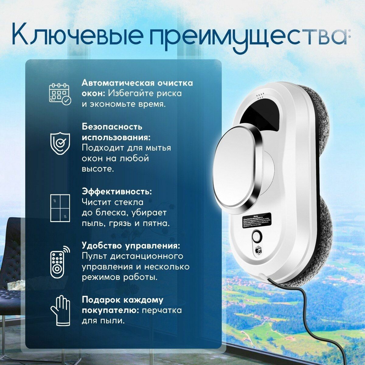 Робот для мытья окон с автоматической очисткой и безопасностью