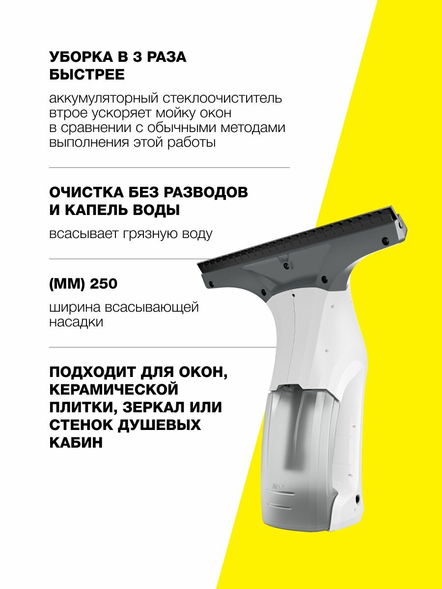 Стеклоочиститель аккумуляторный Karcher WV 1 1.633-601.0, время автономной работы до 25 мин, съемный бак для грязной воды 100 мл информация:
