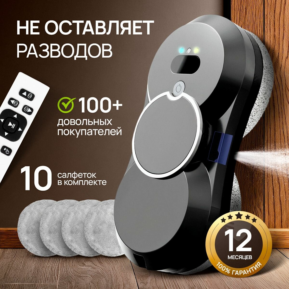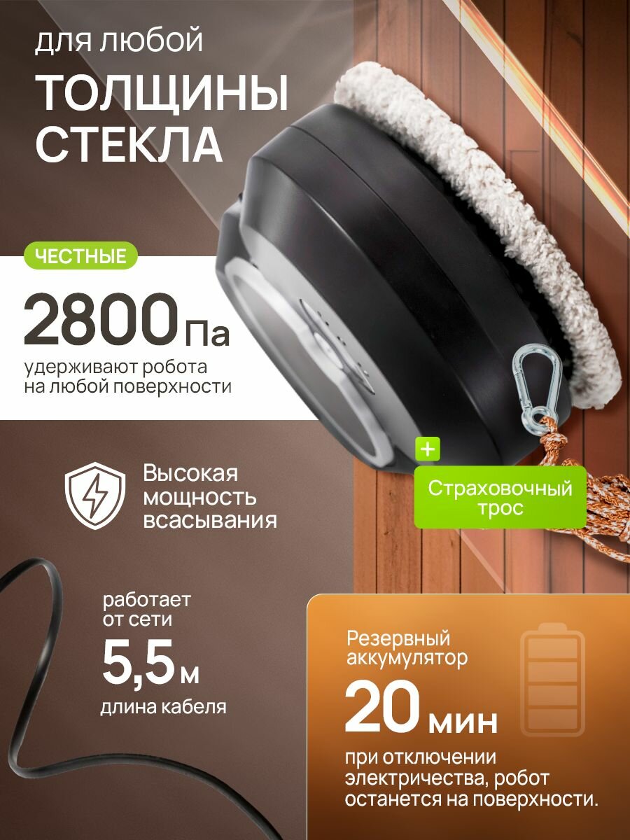 Робот-мойщик окон, с распылителем, страховочный шнур 4 м, пульт ДУ, 90 Вт, 10 сменных тряпок