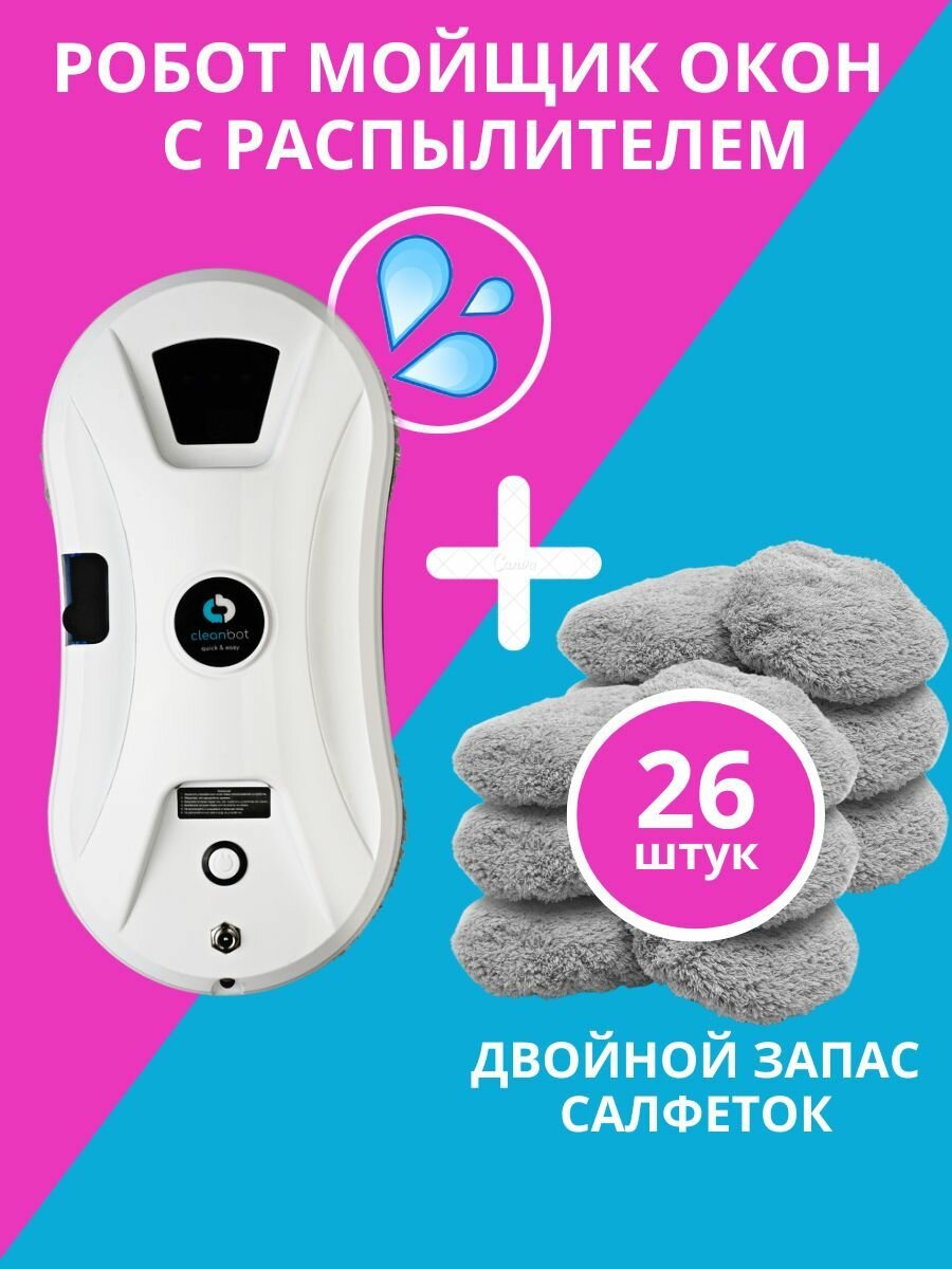 Робот-мойщик окон, с распылителем, страховочный шнур 4 м, пульт ДУ, 90 Вт, 10 сменных тряпок