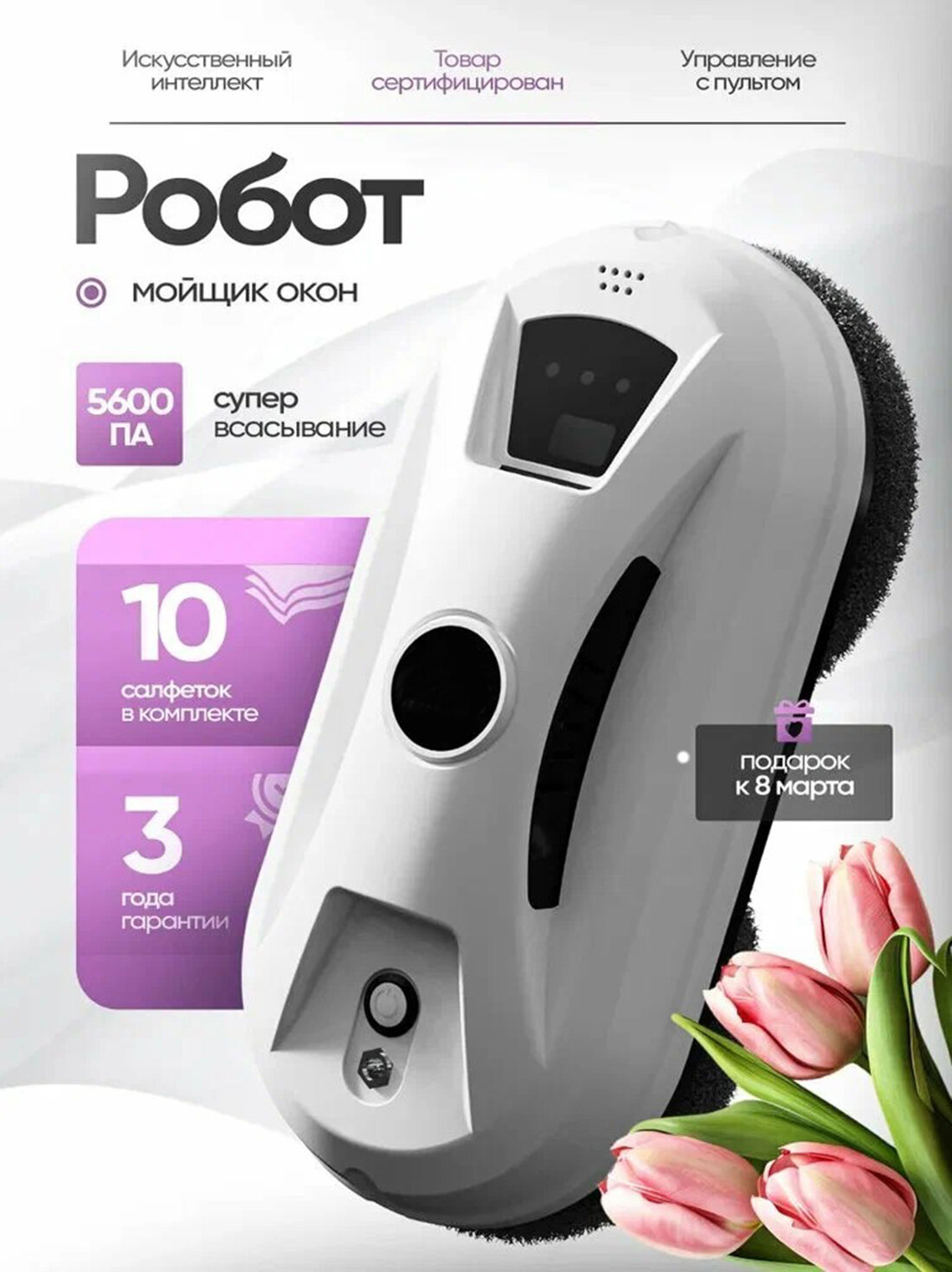 Робот для мытья окон, 80Вт, пульт, страховочный шнур, моющие салфетки из микрофибры, со сменными салфетками 10 шт информация: