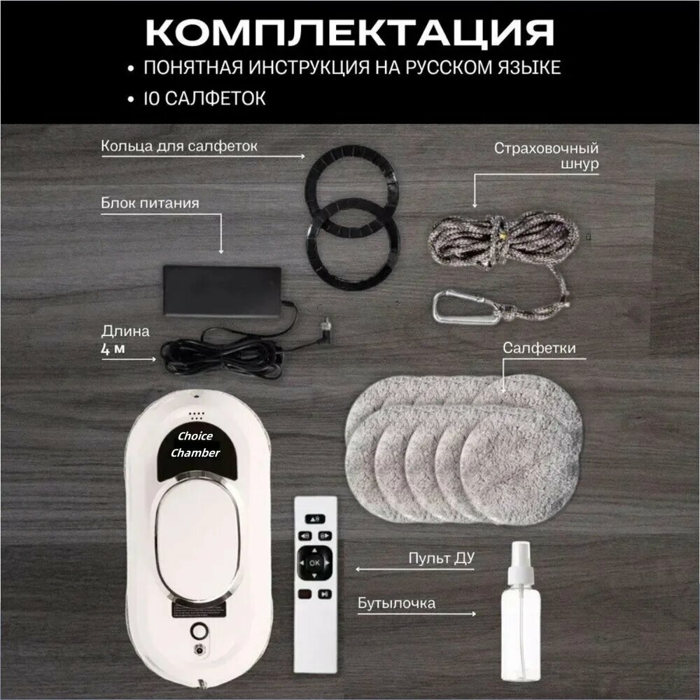 Робот-мойщик окон, с распылителем, страховочный шнур 4 м, пульт ДУ, 90 Вт, 10 сменных тряпок