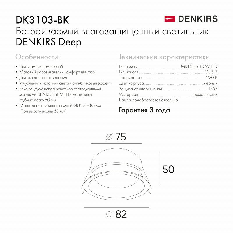 Светильник в ванную комнату влагозащищенный Denkirs Deep DK3103-BK информация: