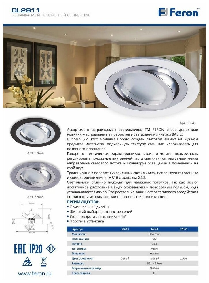 Светильник потолочный DL2811 MR16 50W G5.3 "круг", белый информация: