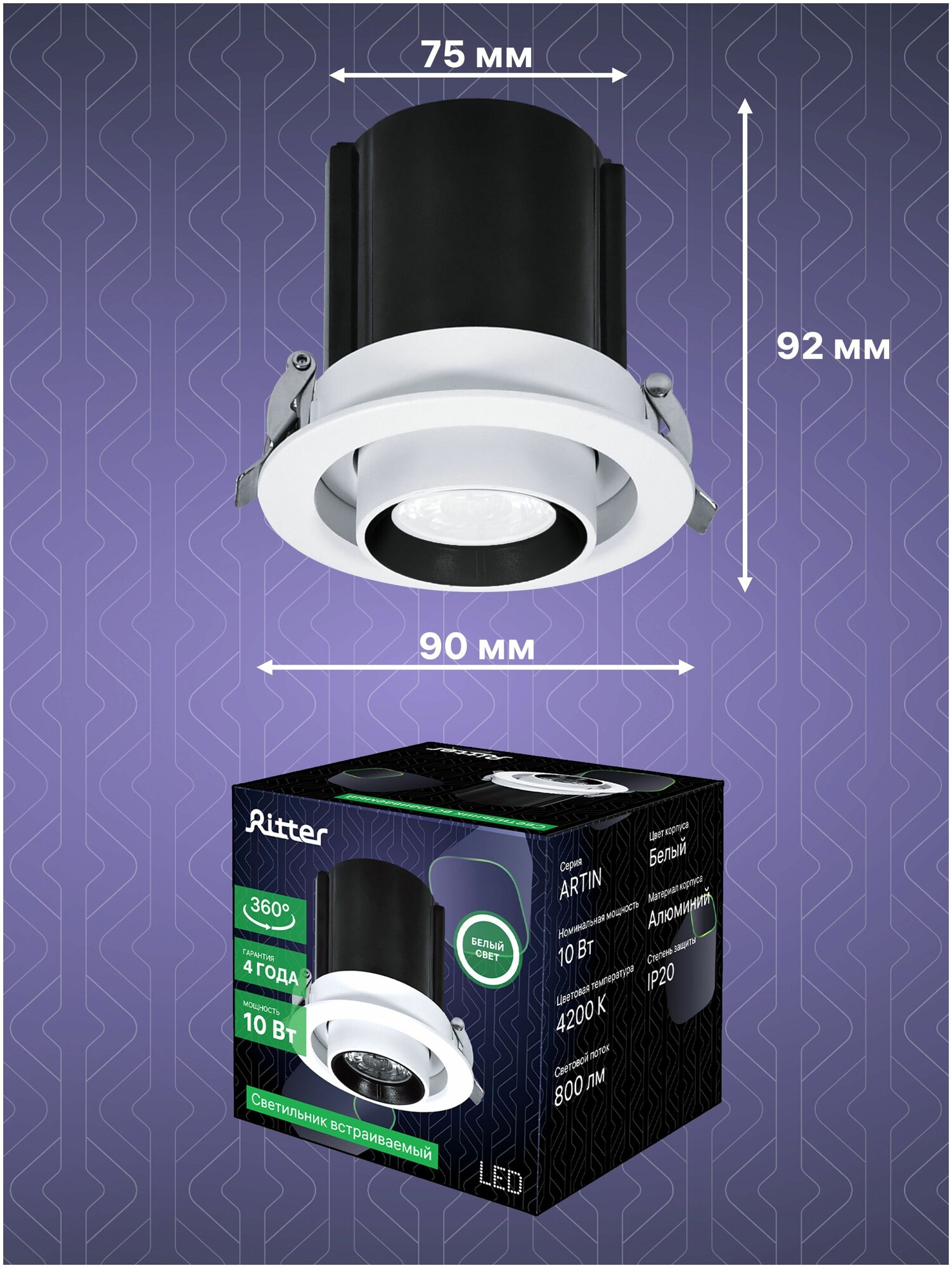 Спот поворотный точечный встраиваемый светодиодный Ritter Artin 59995 1 под отверстие 95 мм цвет белый 1 456 ₽