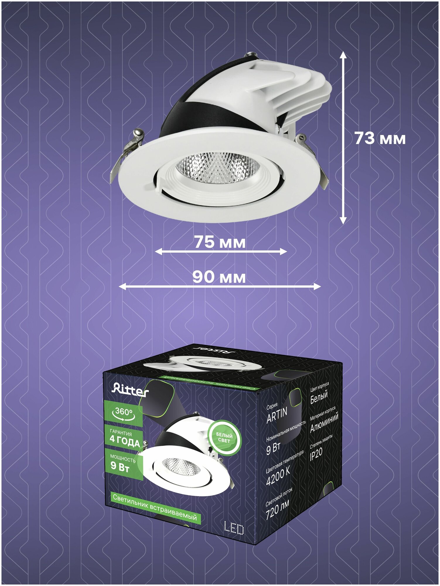 Ritter Светильник спот поворотный светодиодный встраиваемый ARTIN, 9Вт, 59994 4 информация: