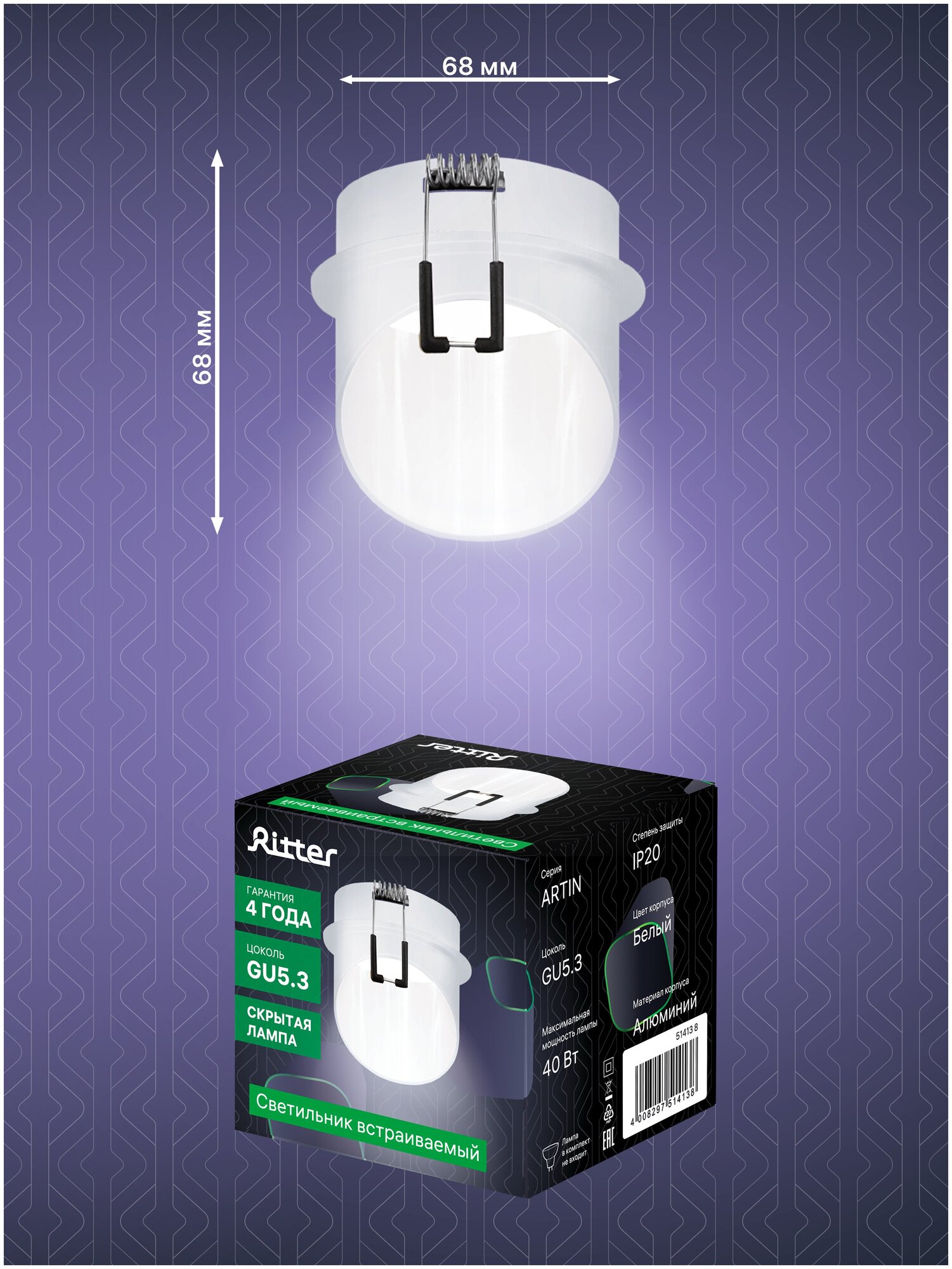 Светильник встраиваемый потолочный Artin, 84х84х35мм, монтажное отверстие 75х75мм, GU5.3, белый, Ritter, 51439 8 109 ₽