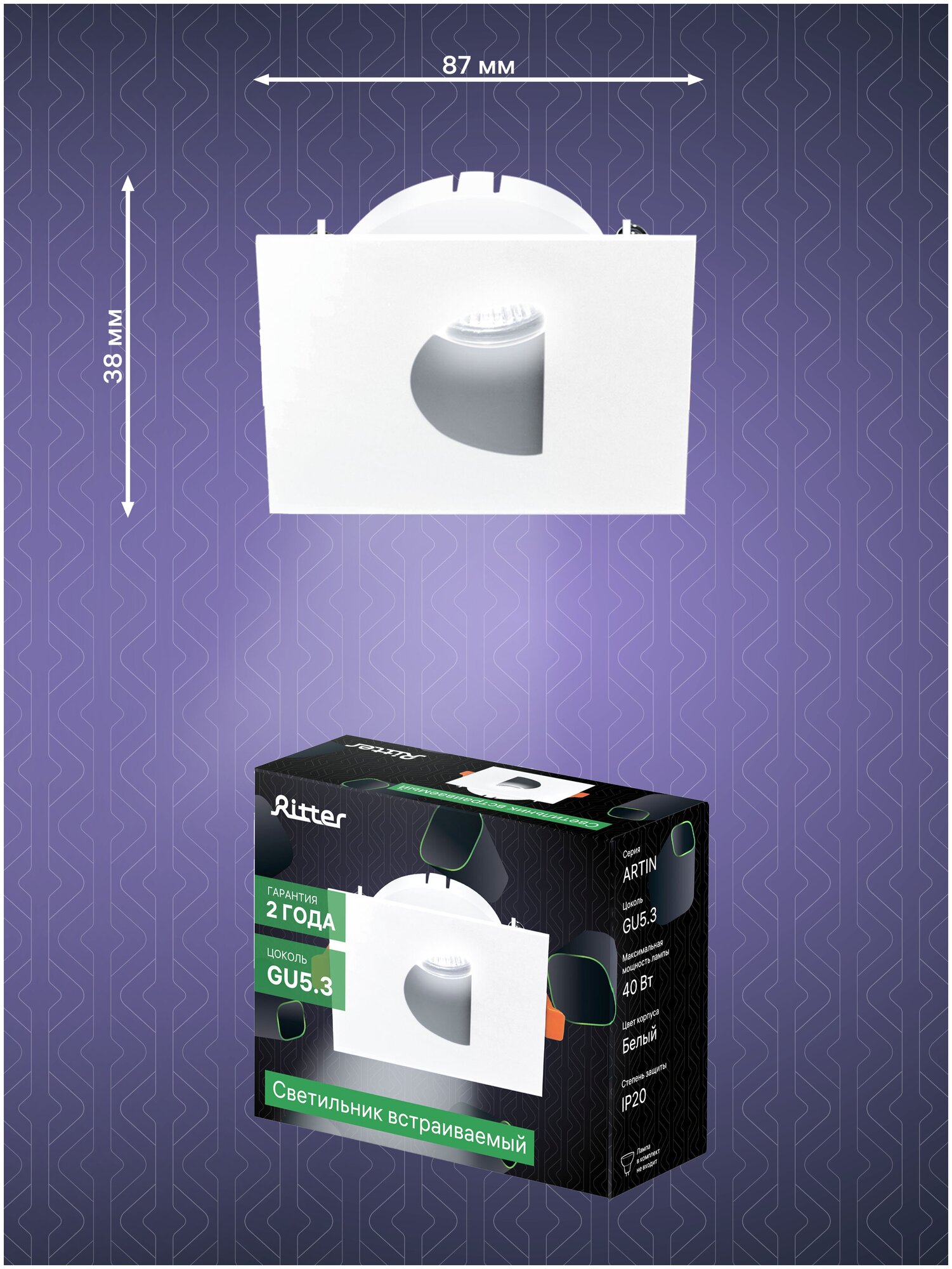 Светильник встраиваемый потолочный Artin, 87х87х38мм, монтажное отверстие 75х75мм, GU5.3, алюминий, белый, Ritter, 51433 6 информация: