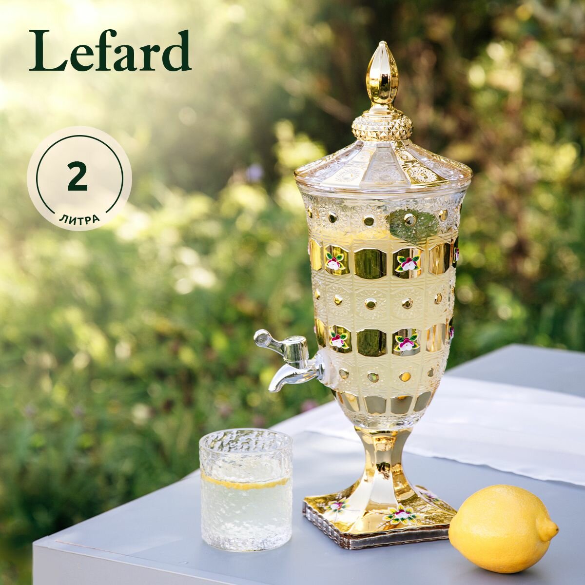Отзывы на Диспенсер для напитков из стекла с краном "Лимонадница Lefard Gold Glass" 2 л, 16 х 16 х 45 см