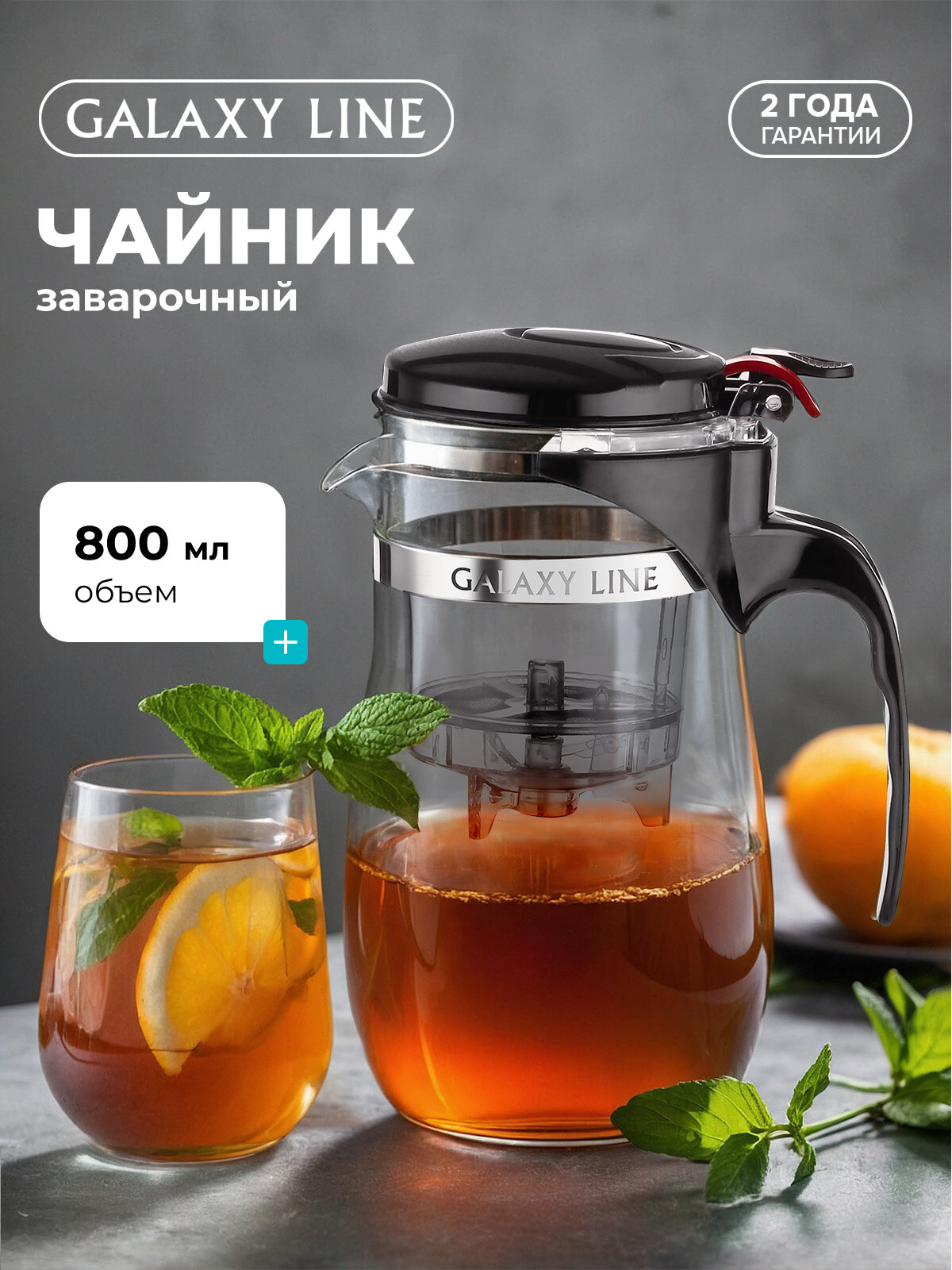 Чайник заварочный GALAXY LINE GL9311, с фильтром, ситечком, черный, прозрачный, 800мл информация: