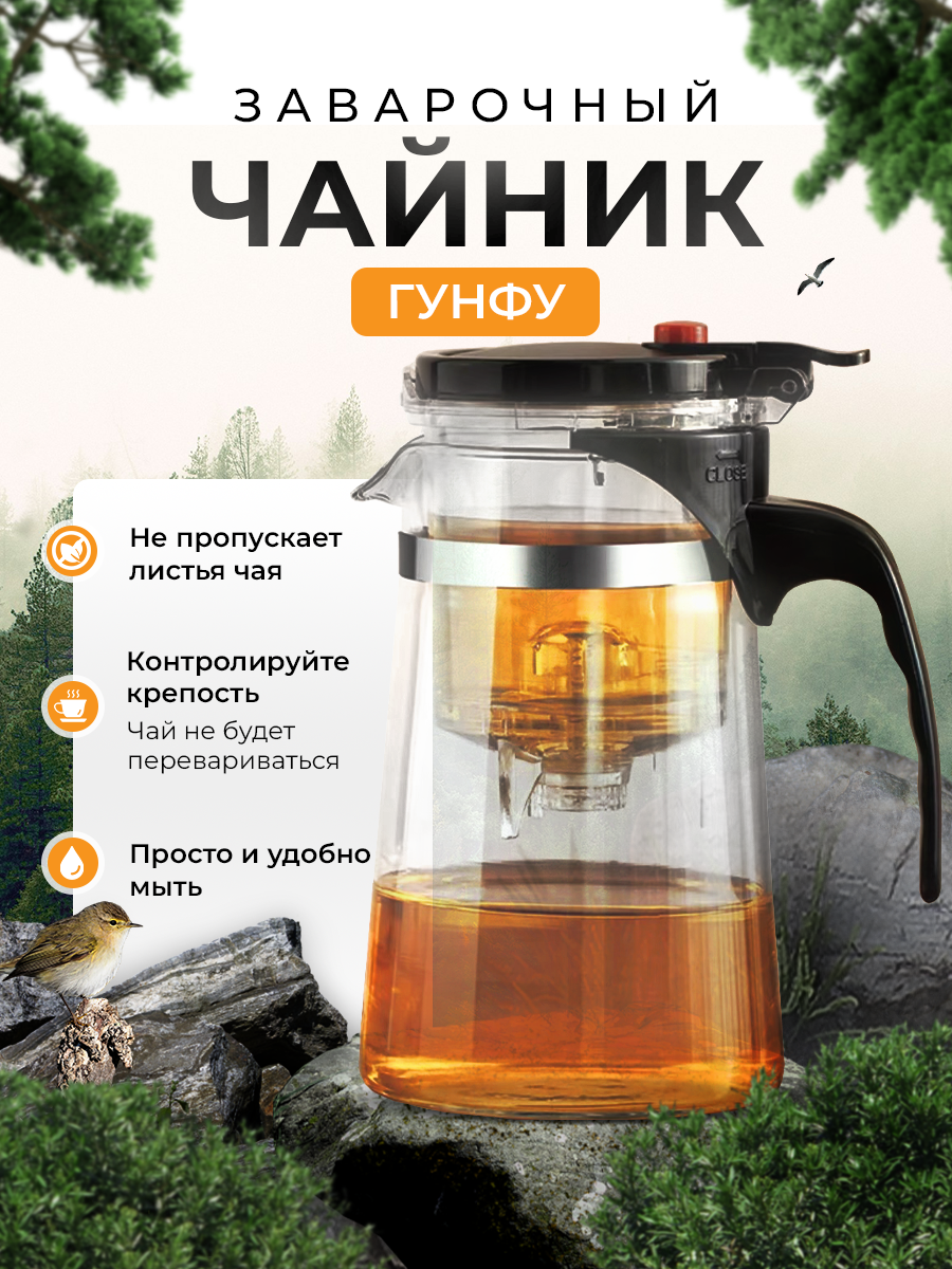 10 цен на Чайник заварочный Loochi Гунфу, с кнопкой, стекло/пластик, прозрачный, 0.75л