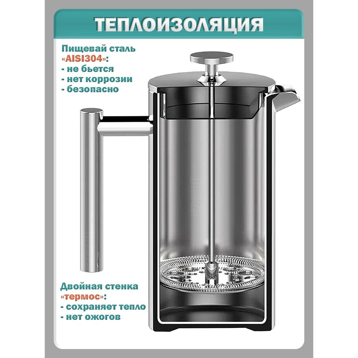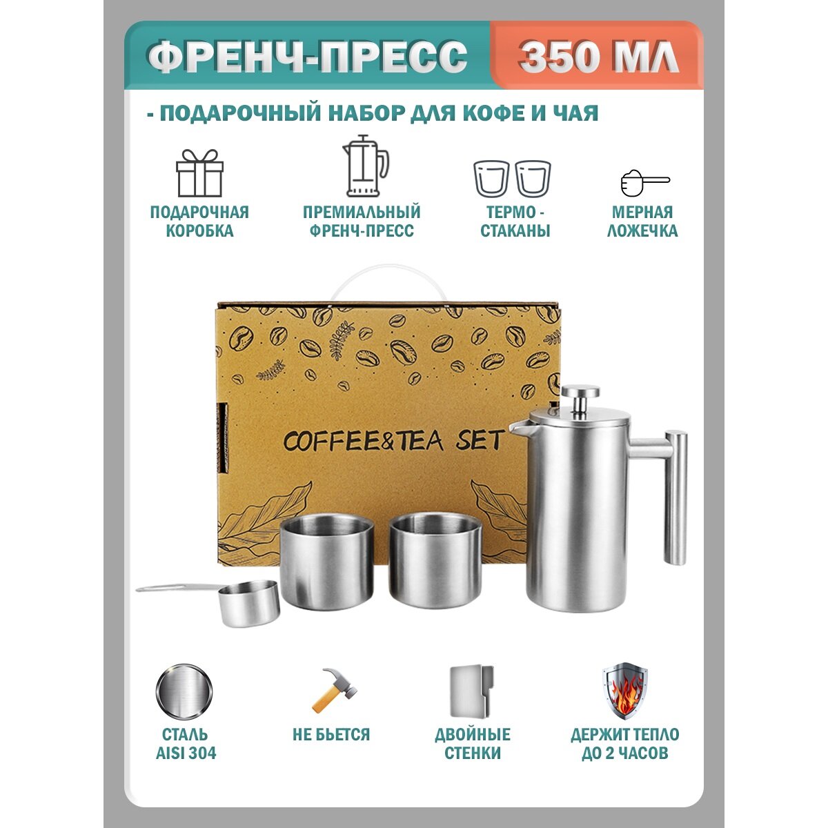 Френч-пресс для кофе и чая - 350 мл, набор с ложкой и кружками из нержавеющей стали информация: