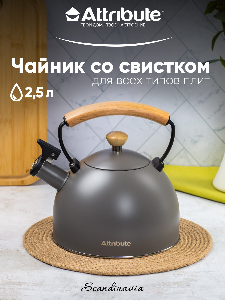 Чайник со свистком Attribute SCANDINAVIA 2.5л серый, 1 штука, для всех типов плит информация: