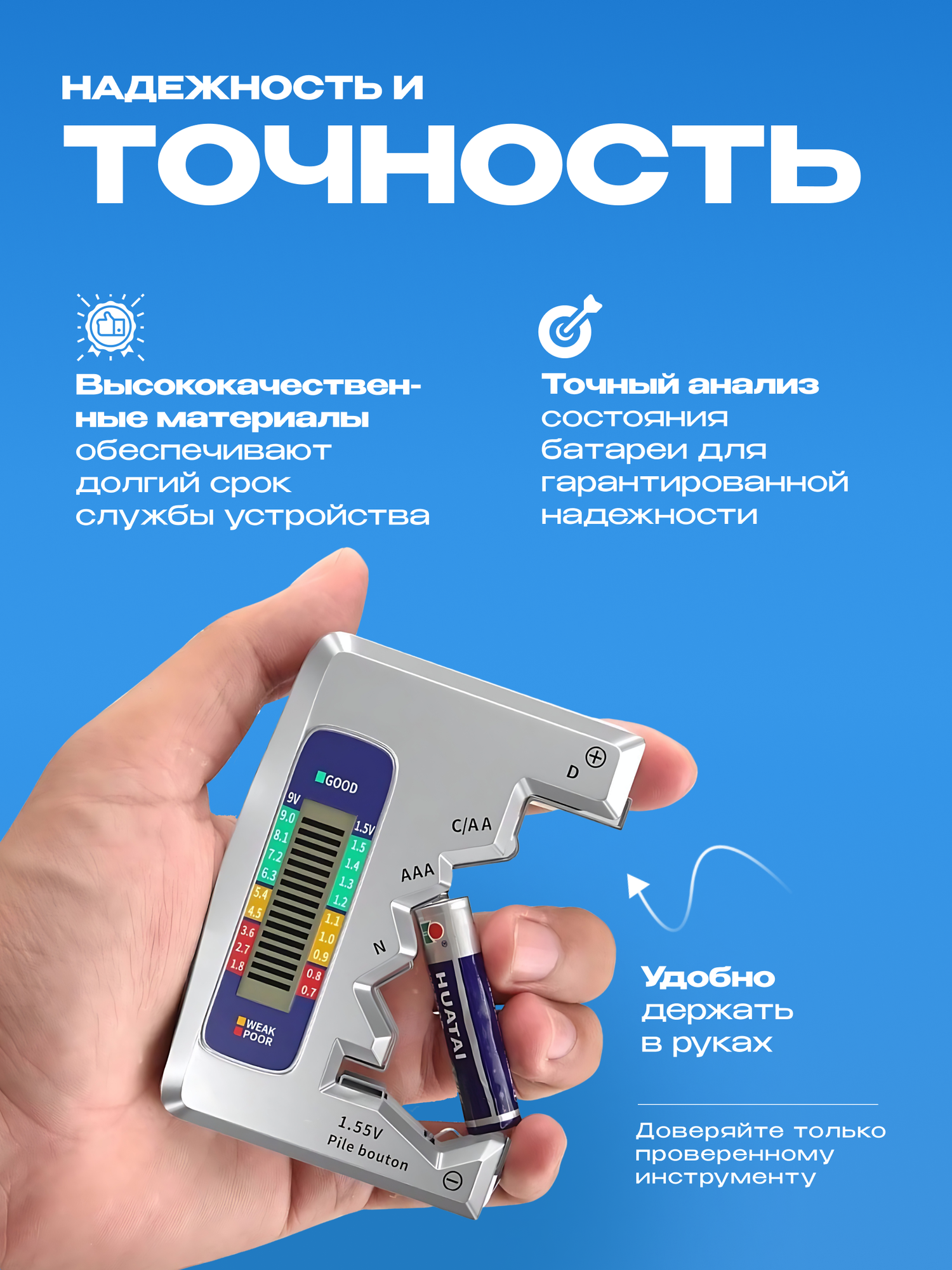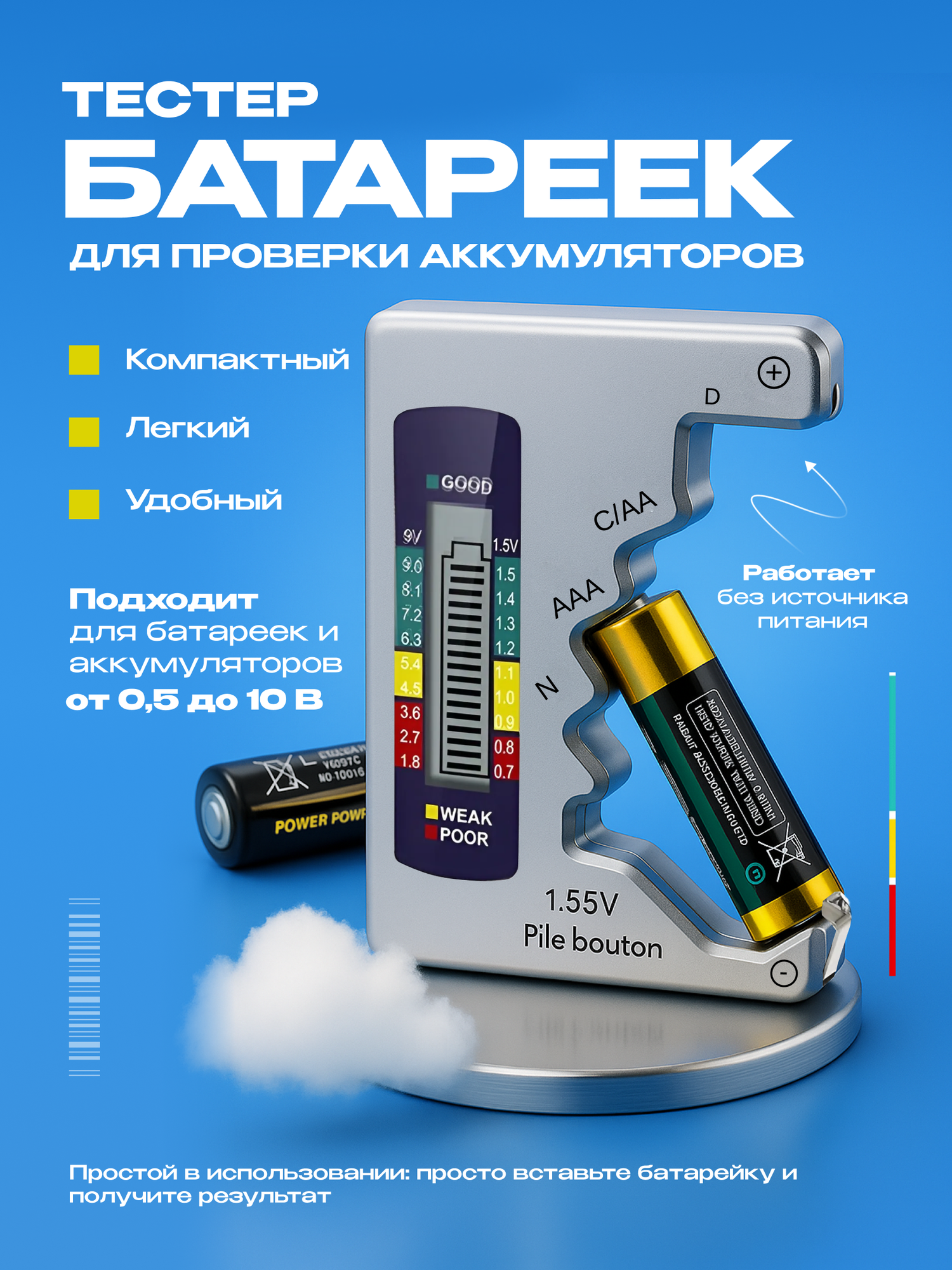 Компактный цифровой тестер с дисплеем для измерения постоянного напряжения и определения уровня заряда батареек информация: