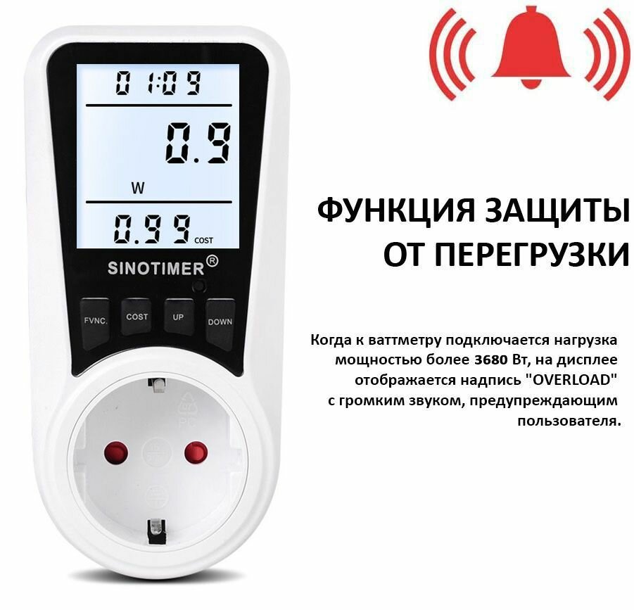 Бытовой розеточный ваттметр c подсветкой, сила тока до 16А информация: