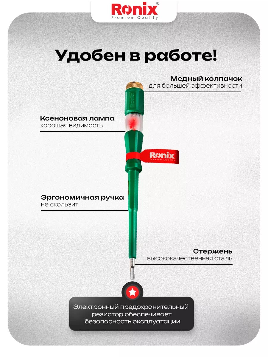 Индикаторная отвертка Ronix 180 мм, цвет зеленый 120-250 V тестер информация: