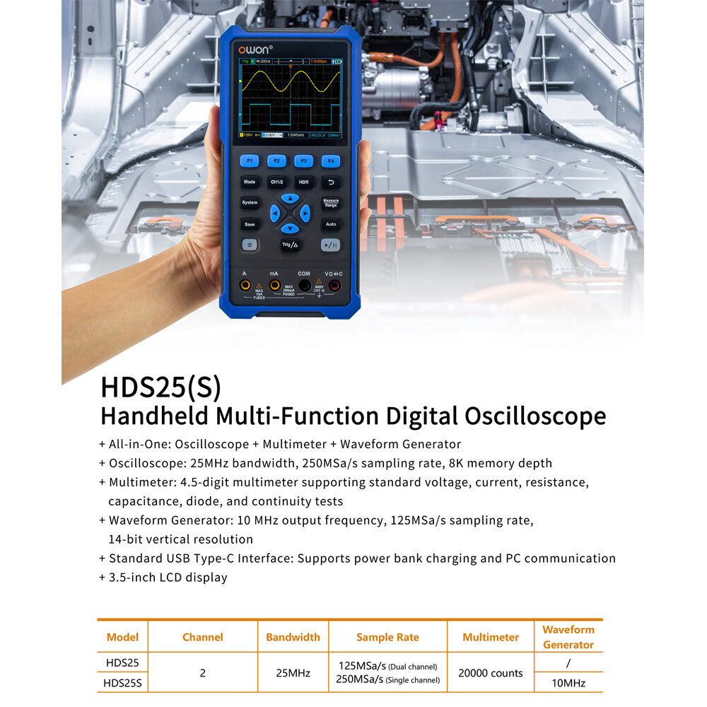 Цифровой осциллоскоп OWON HDS25, двухканальный 25MHz 250MSa/s, 4,5 цифры 20000 счетов истинный мультиметр RMS информация: