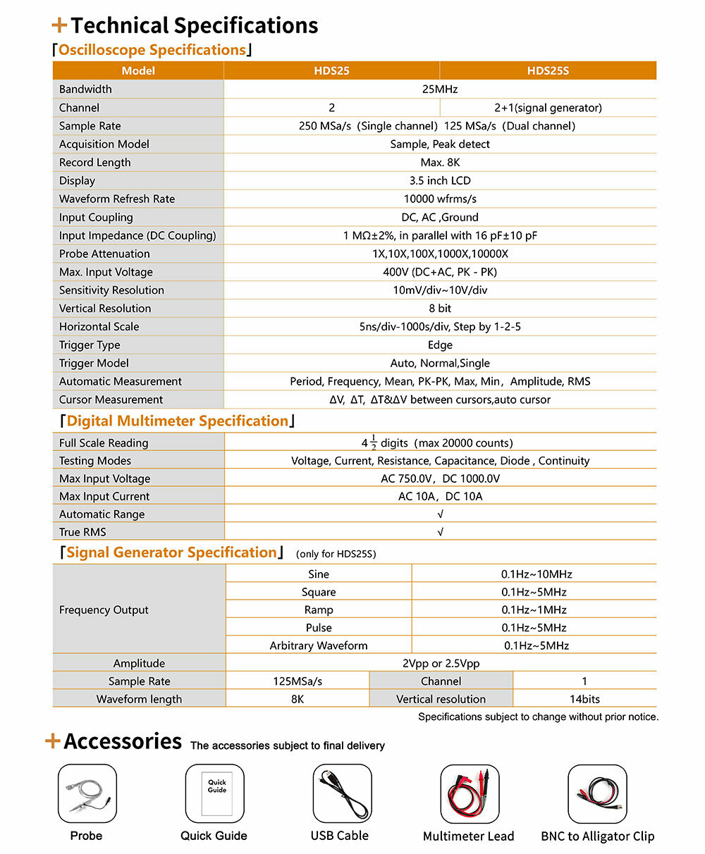 10 цен на ОWON HDS25S 2CH цифровой осциллоскоп, 25MHz, 250MSa / с, истинный мультиметр RMS, 25MHz AFG