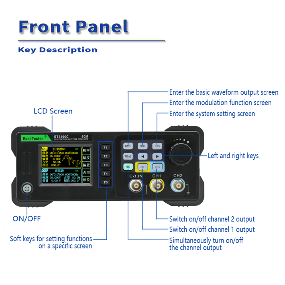 Отзывы на East Tester ET3360C 2 - канальный генератор произвольной формы волны, частота отбора проб 200 MSA / s, синус 60 МГц