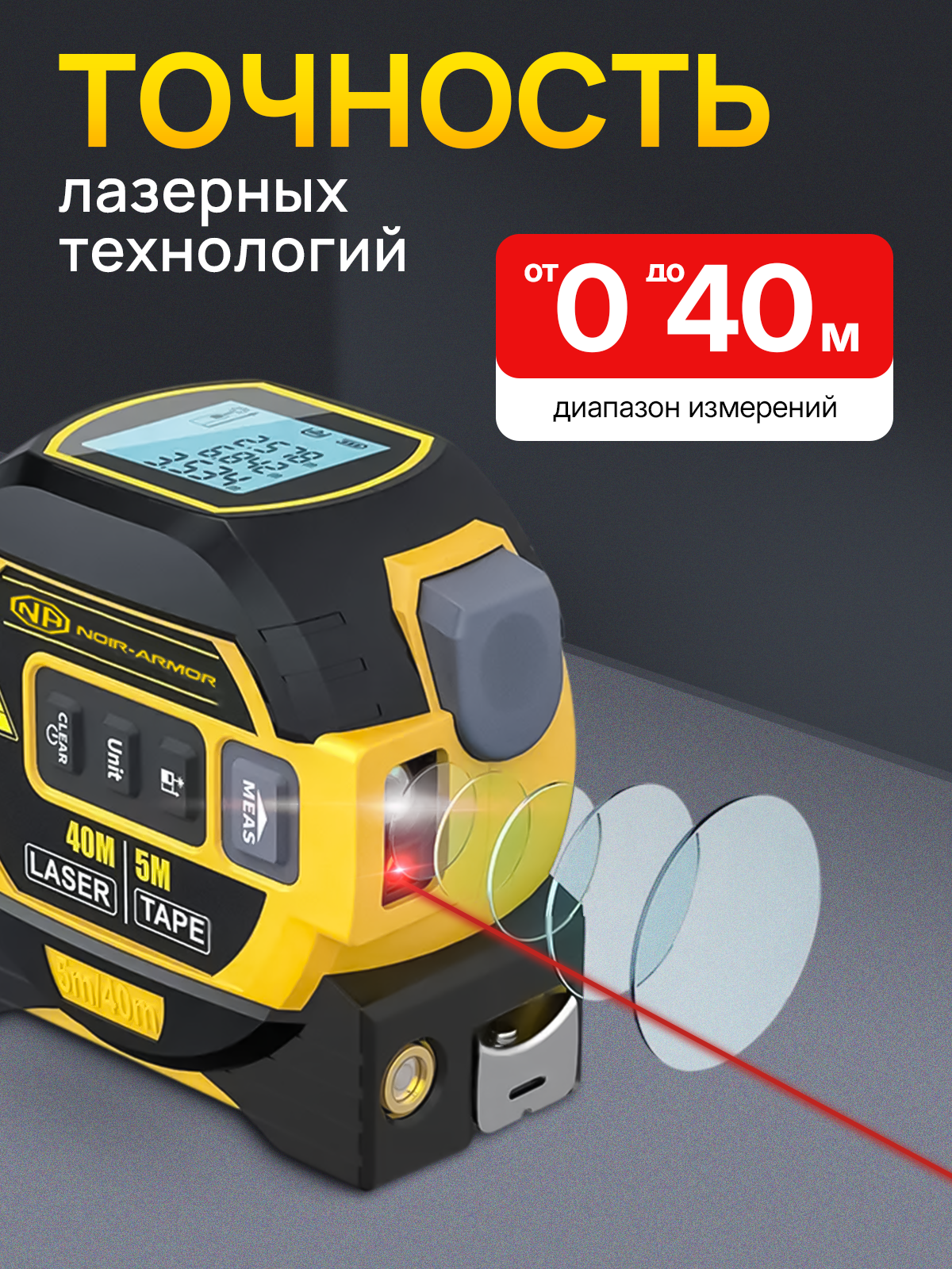 Лазерная рулетка NOIR Audio 3в1, оранжево-черная, дальность 40м, встроенная память информация: