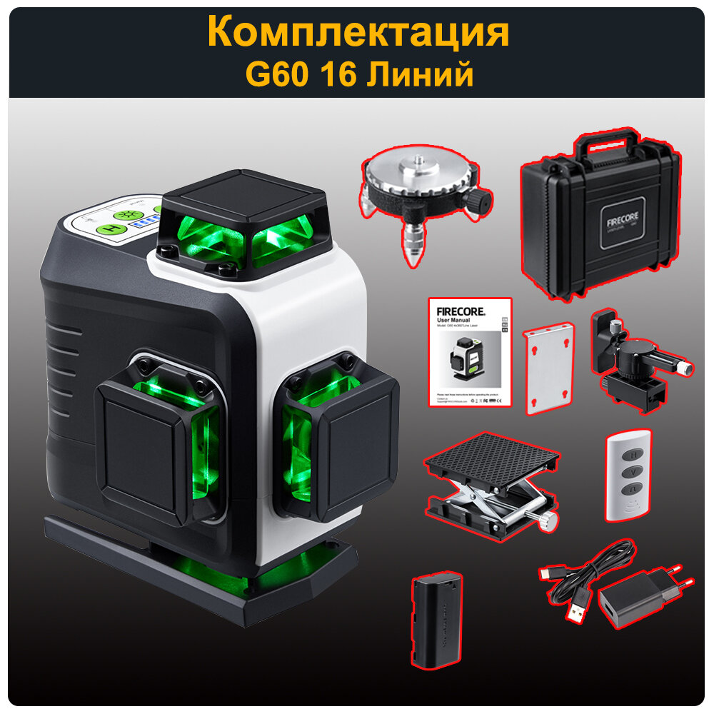 Лазерный уровень/нивелир FIRECORE G60, 4D 16 Линий, Зеленый луч информация: