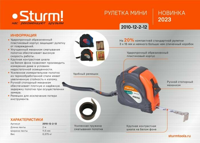 Рулетка STURM 2010-12-2-12 6,1*25мм. мини 2x11.5мм, обрезиненный корпус информация: