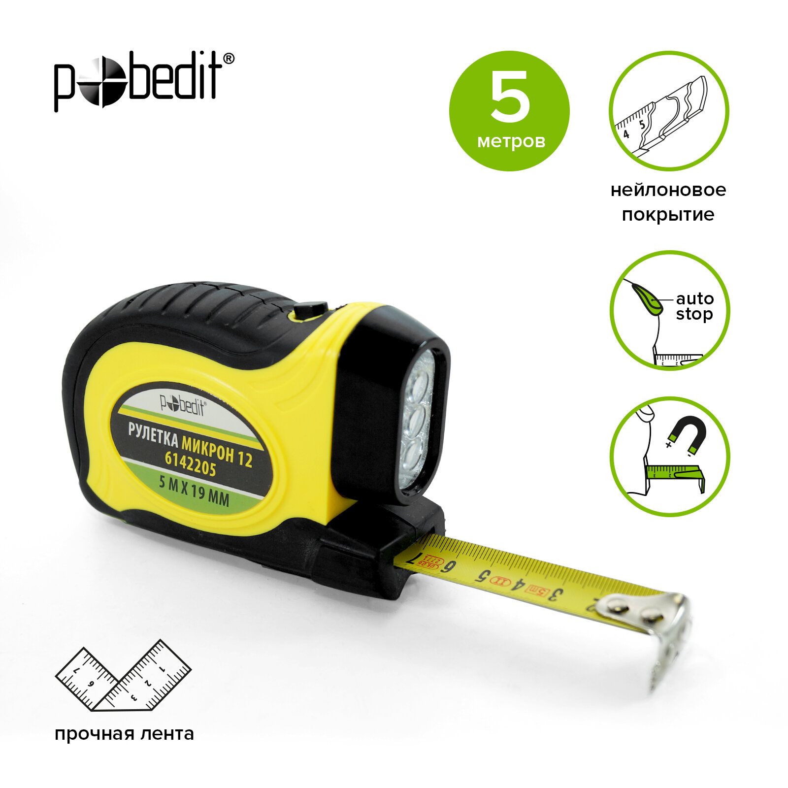Рулетка строительная 5м х 19мм с обрезиненным корпусом и фонариком Pobedit информация: