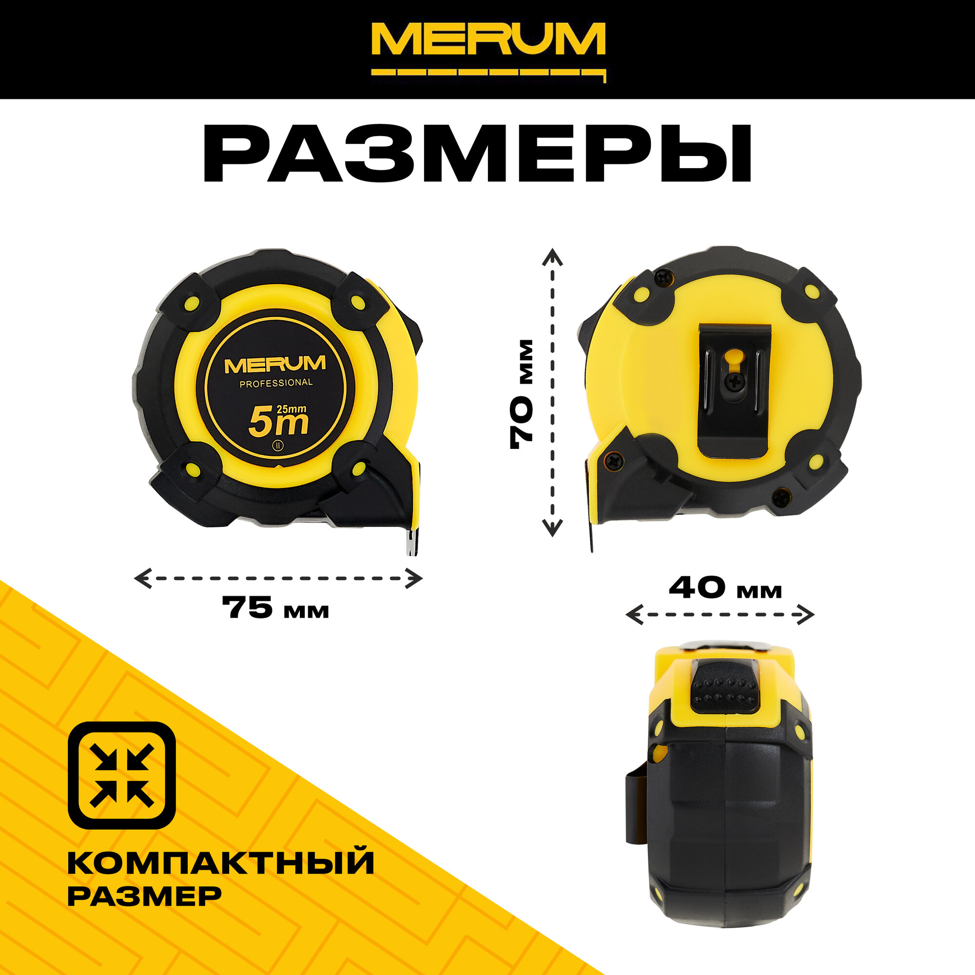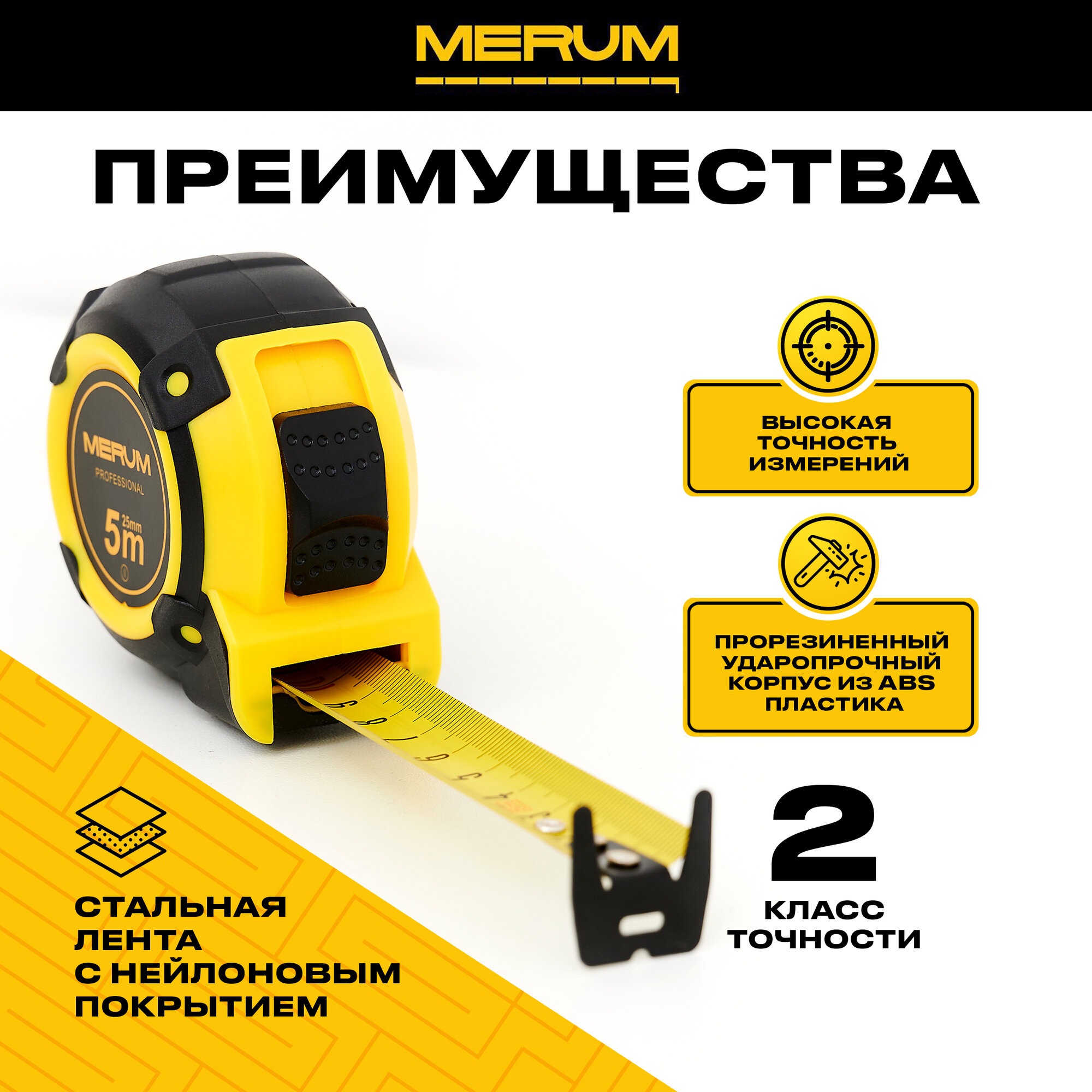 Рулетка строительная, MERUM, ABS-пластик, 5м x 25мм, сталь, профессиональная, двойной зацеп информация: